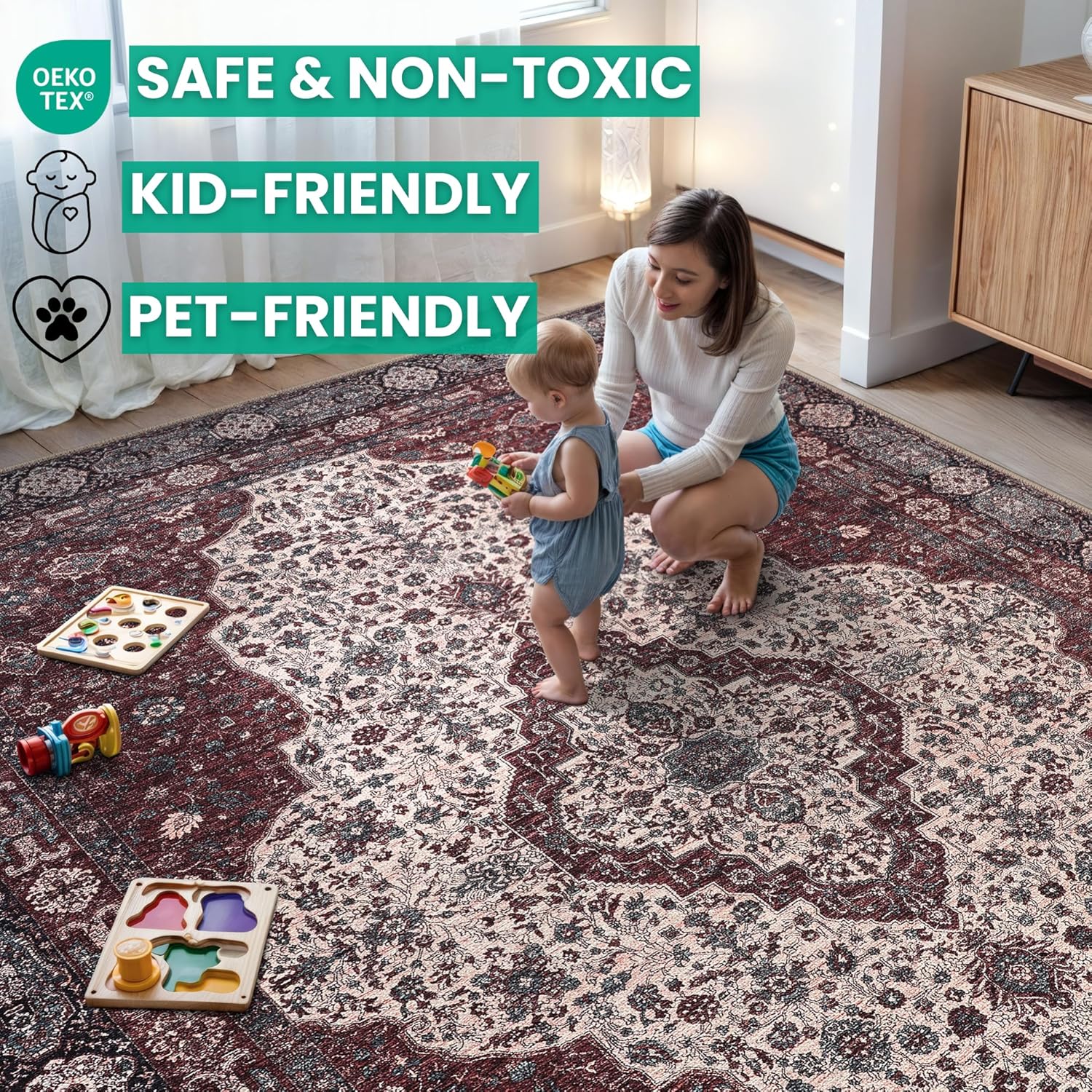 • MACHINE WASHABLE: Machine wash on delicate cycle (do not use bleach) at 85°F (30°C) and line dry or dry on air-only cycle without heat. Vacuum regularly and spot clean small stains. This easy to clean rug is perfect for families with kids and pets, and for high traffic areas.