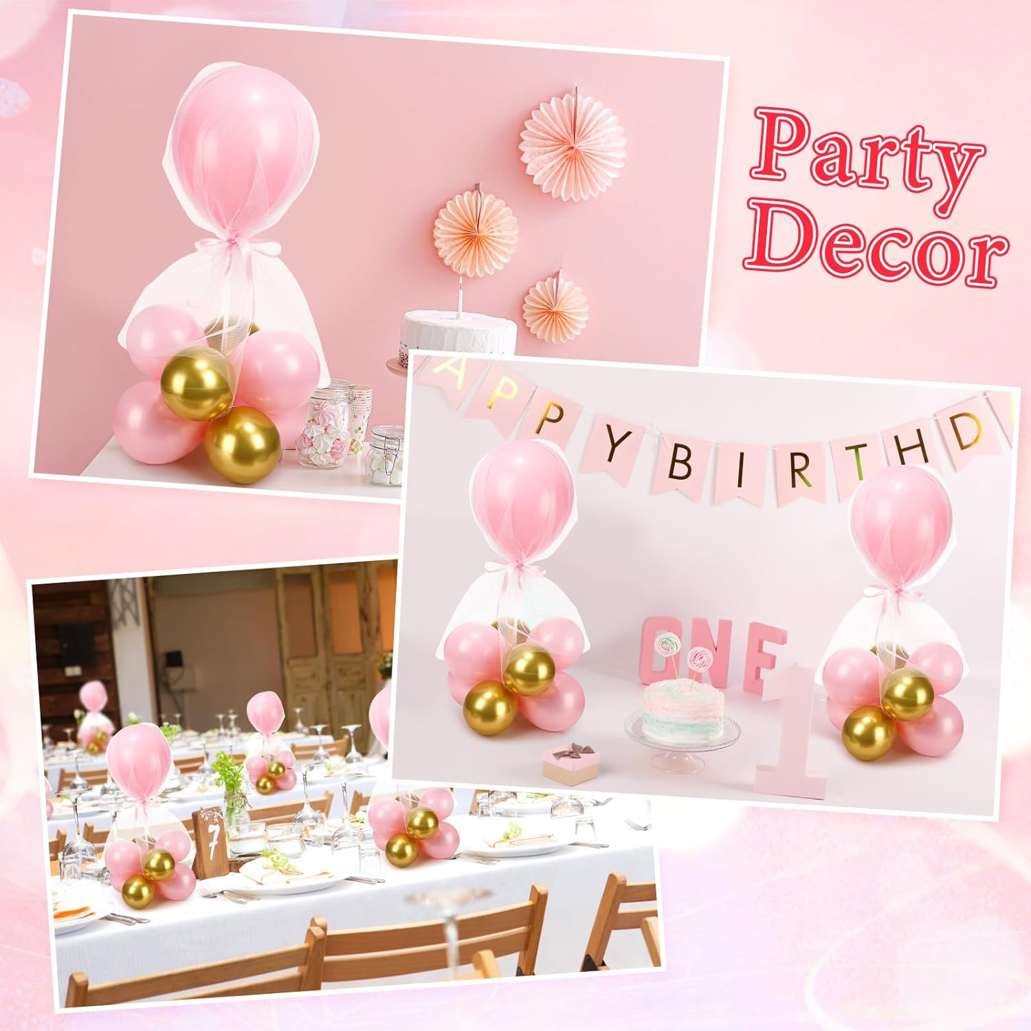 - What You Get: you'll receive a nice value balloon pack that includes 8 reusable tabletop balloon sticks, 8 balloon bases, 16 round snaps, 8 white gauze covers, 8 balloon fixed holders, 72 pieces of 5 inch latex balloons (36 bright pink and 36 gold), 8 pieces of 12 inch macaroon bright pink latex balloons and 8 pieces pink thick ribbons; Please note that the color will be closer to the picture after inflated