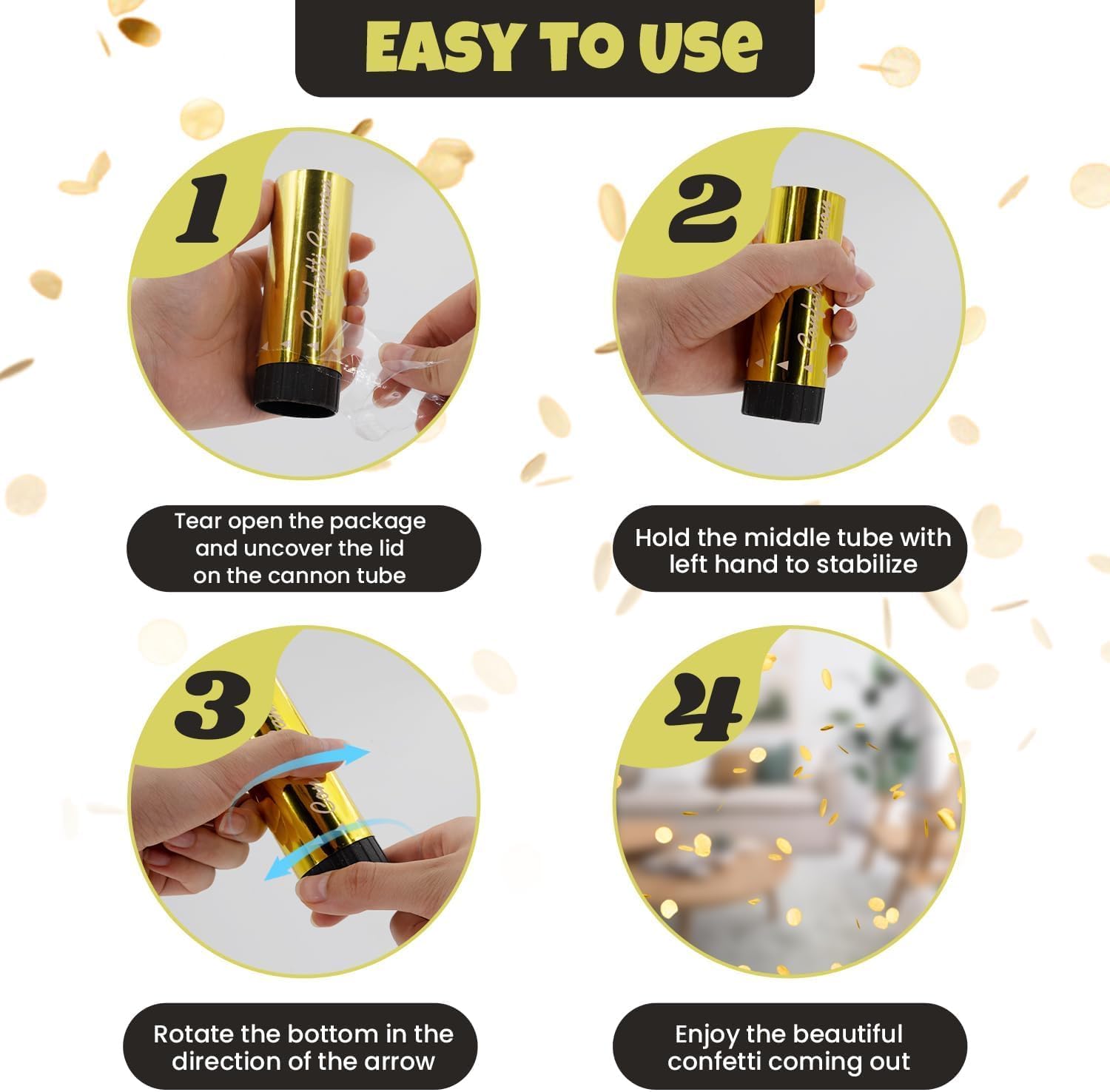 - 【Safe & Easy to Use】Our mini golden confetti cannon kit contains gold foil confetti are non-toxic. Small party poppers confetti shooters work well indoors and outdoors easy to clean and 100% safety, you and your guests can enjoy confetti cannon for your celebrations party.Just give each confetti cannon a hard twist and let the magic happen!