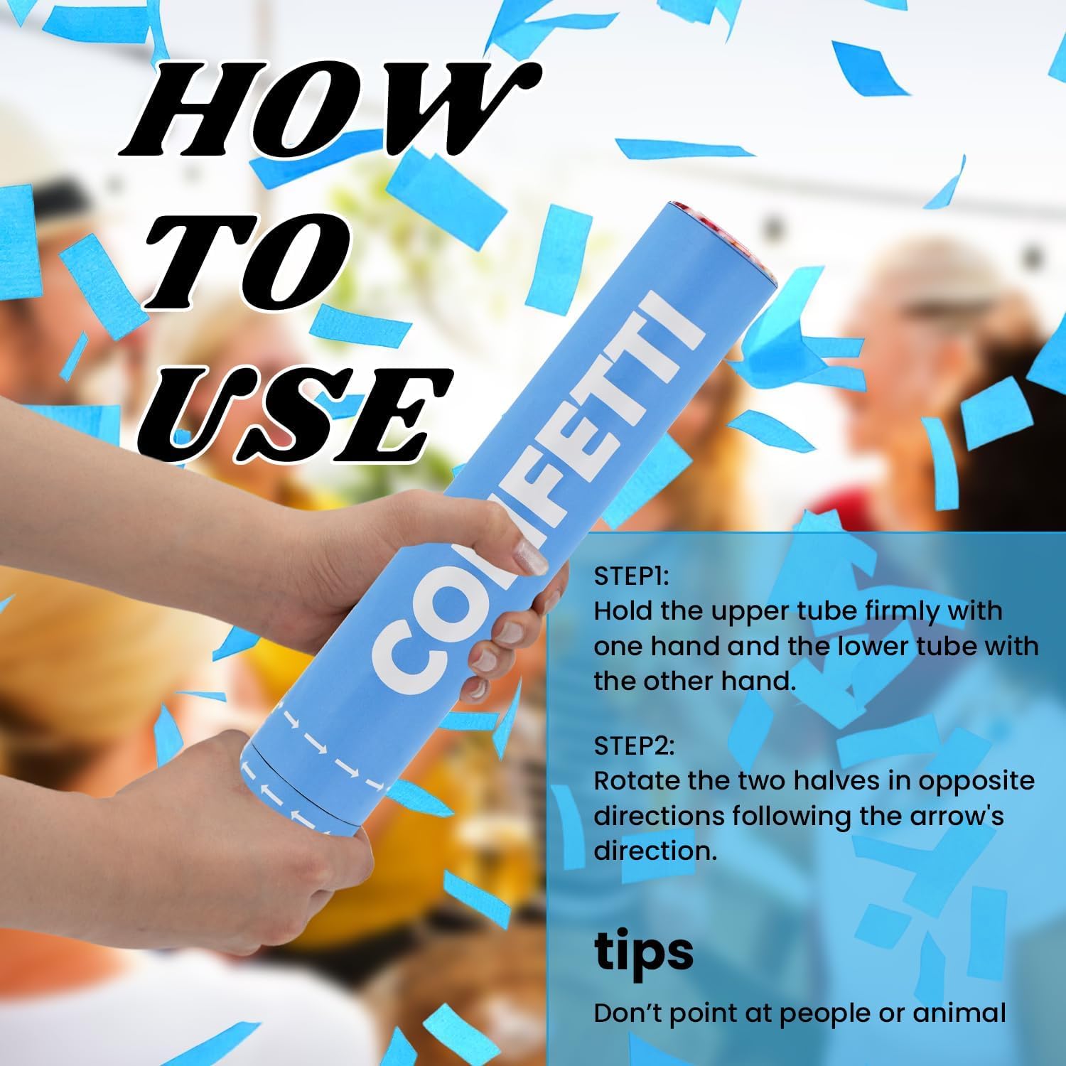 - 【Safe & Easy to Use】Our blue biodegradablel confetti cannon kit contains Blue paper confetti are friendly, non-toxic. Biodegradable party poppers confetti shooters work well indoors and outdoors easy to clean and 100% safety, you and your guests can enjoy confetti cannon for your celebrations party.Just give each confetti cannon a hard twist and let the magic happen!