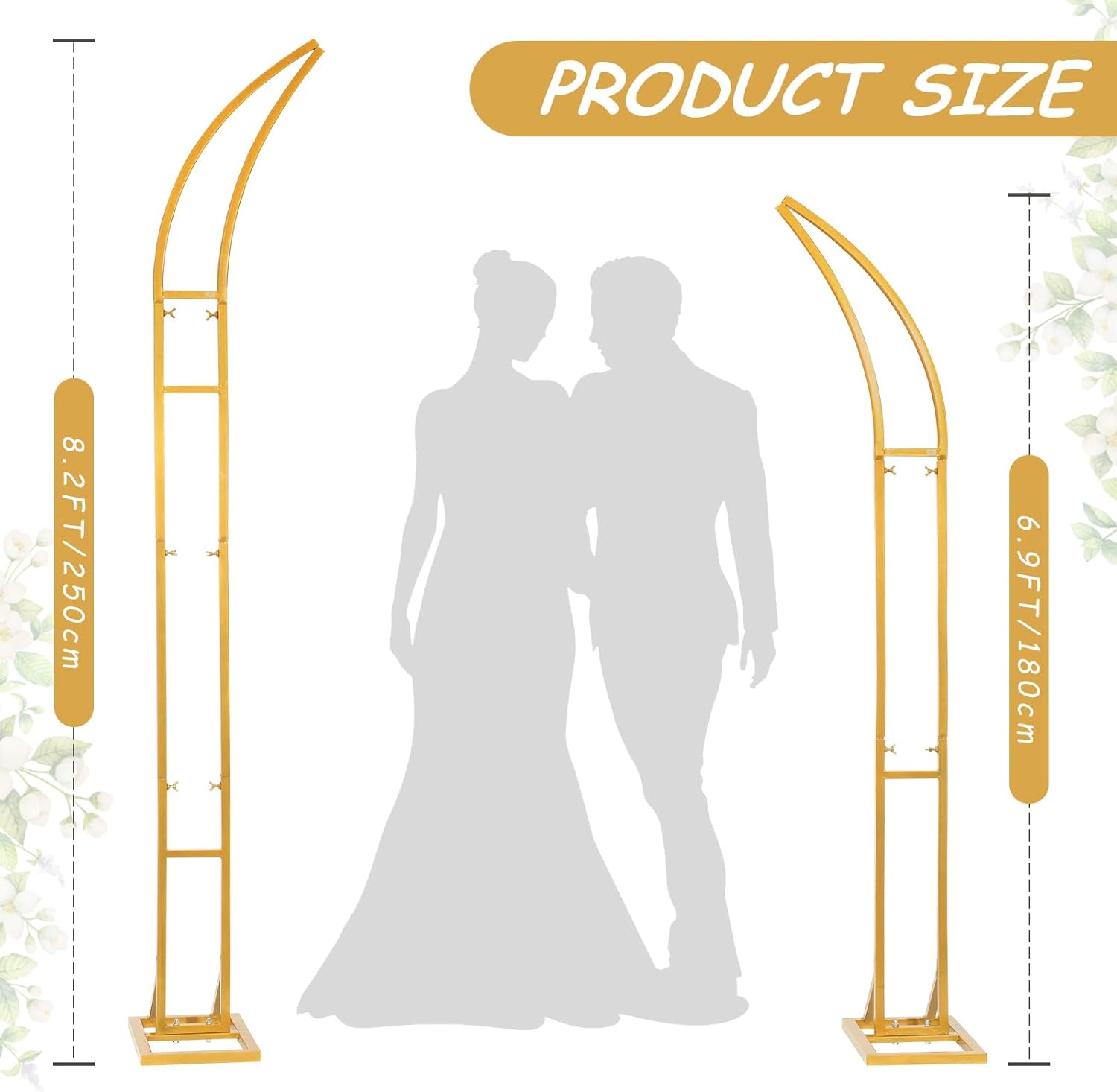 - 【 Large Wedding Metal Arches】:gold and white Balloon Stand, suitable for commercial Photography and personal party Reusable Arch Backdrop Measuring 8.2ft H x 6.9ft H,6.9ft H x 5.9ft H, A variety of colors and sizes for you to choose this arch can be decorated with flowers, lights, or drapes to match any event theme. making it ideal for photography, weddings, and event decora.