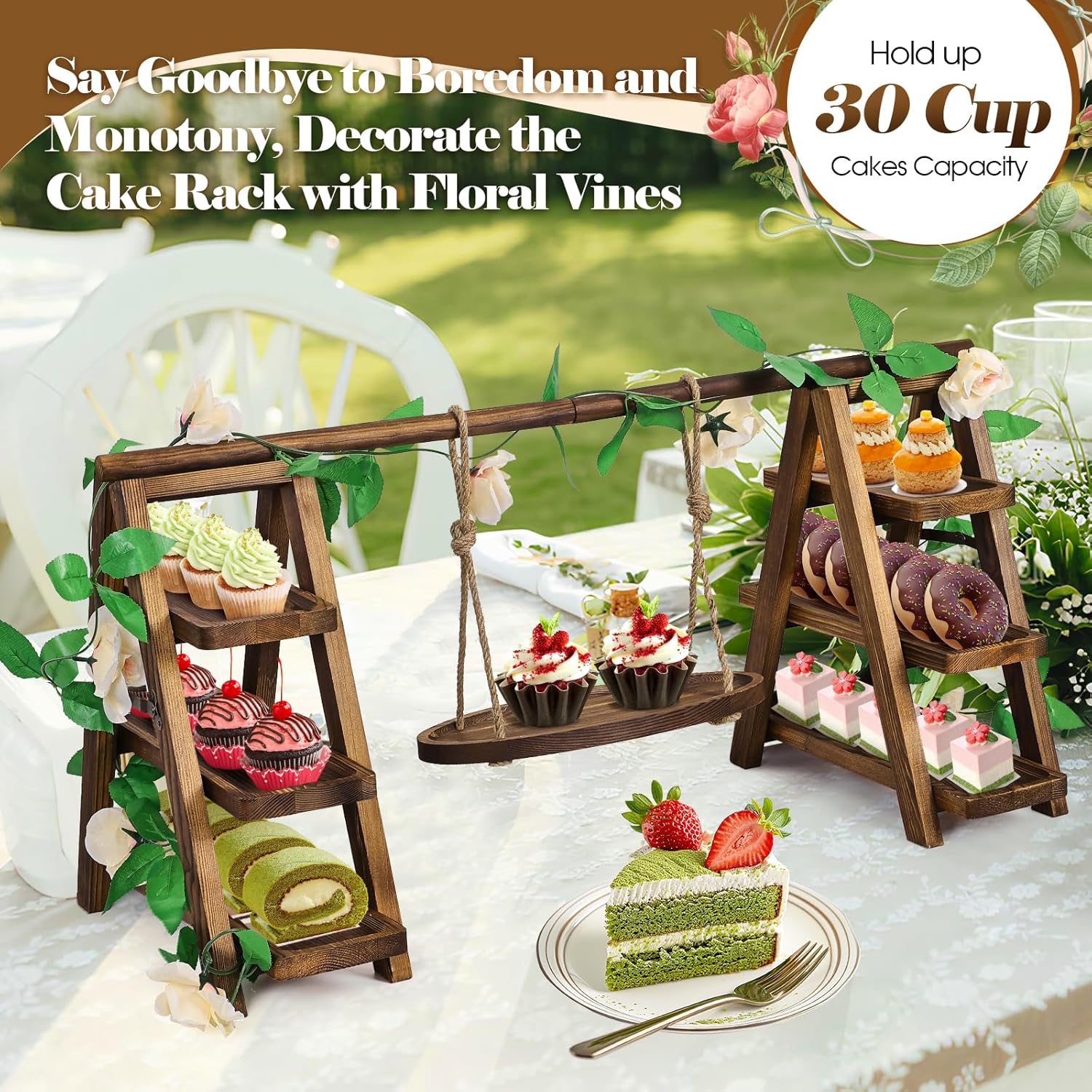 - Elegant Rustic Wooden Cupcake Stand:This 3 tierd serving tray ladder stand features a charming swing and decorative flower accents that add a touch of whimsy. With multiple tiers and the spacious serving platters, it effortlessly showcases cupcakes, fruits, snacks, cheese, donuts,and more.The combination of its Unique appearance and functional design makes it an ideal centerpiece for any celebration or home decor