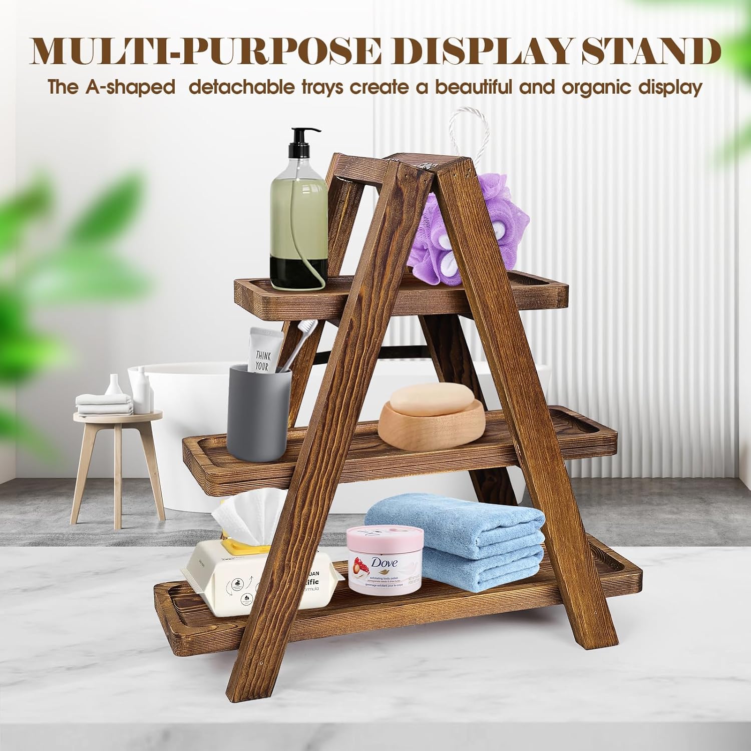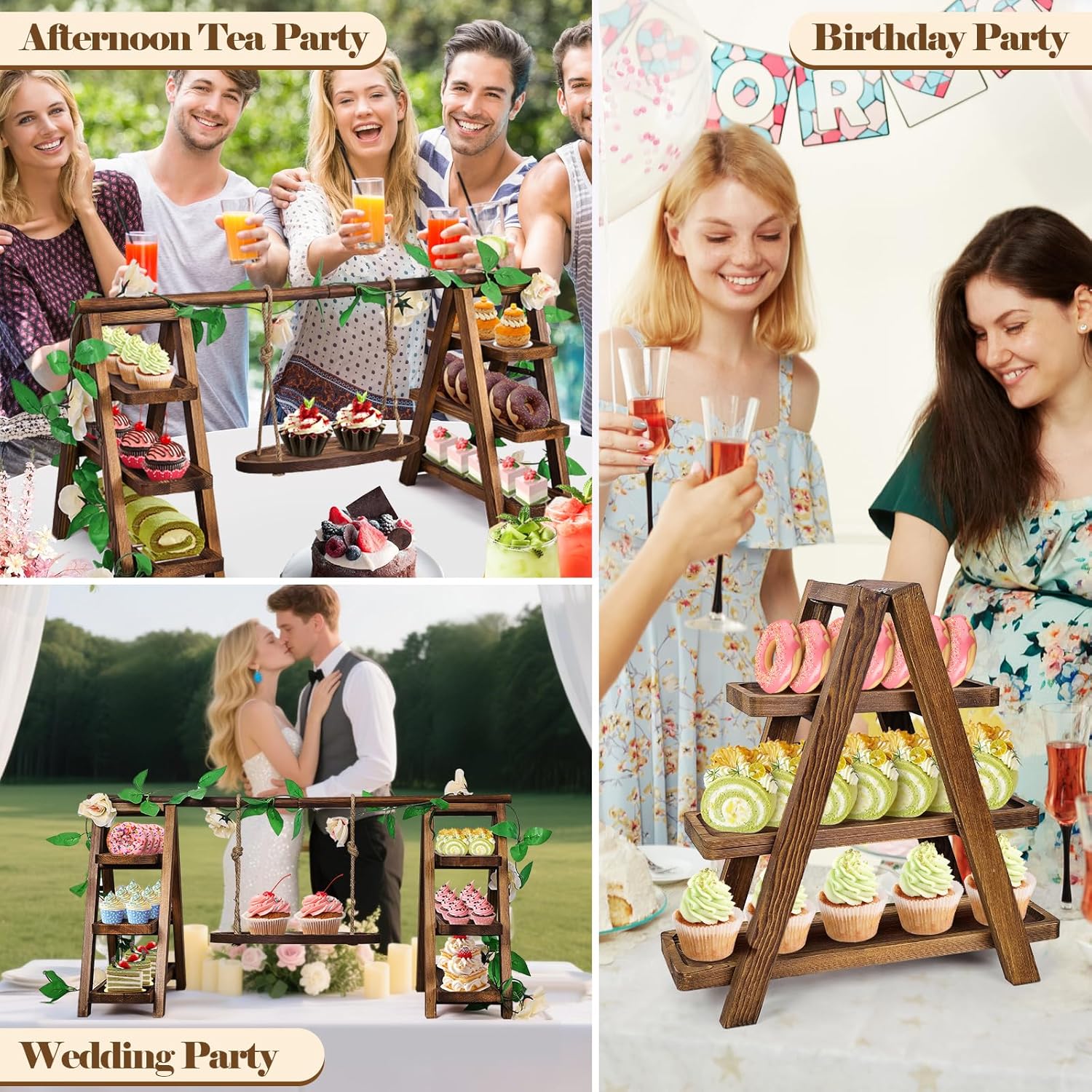 - Stylish and Secure Cupcake Display Stand:This wood cake stand offers three tiers of different sizes,and additional hanging trays, creating an eye-catching and organic display. The sturdy A-frame ensures stability, preventing the stand from tipping over. The anti-slip locks ensure that each tier remains securely in place, preventing any accidental movement. The removable trays offer flexible use and versatility, allowing you to create beautiful displays