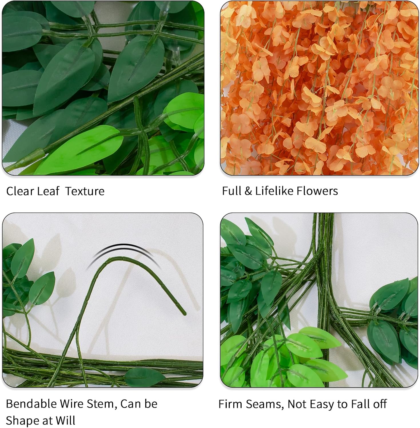 - 🌼Package Content - 24 x Artificial Wisteria Flowers, Orange petal. Size of each artificial flower vine is approx 43.2"/3.6 feet in length per wisteria with 3 branches flower string, each string is 23.62" in length with more flowers, looks full and beautiful.