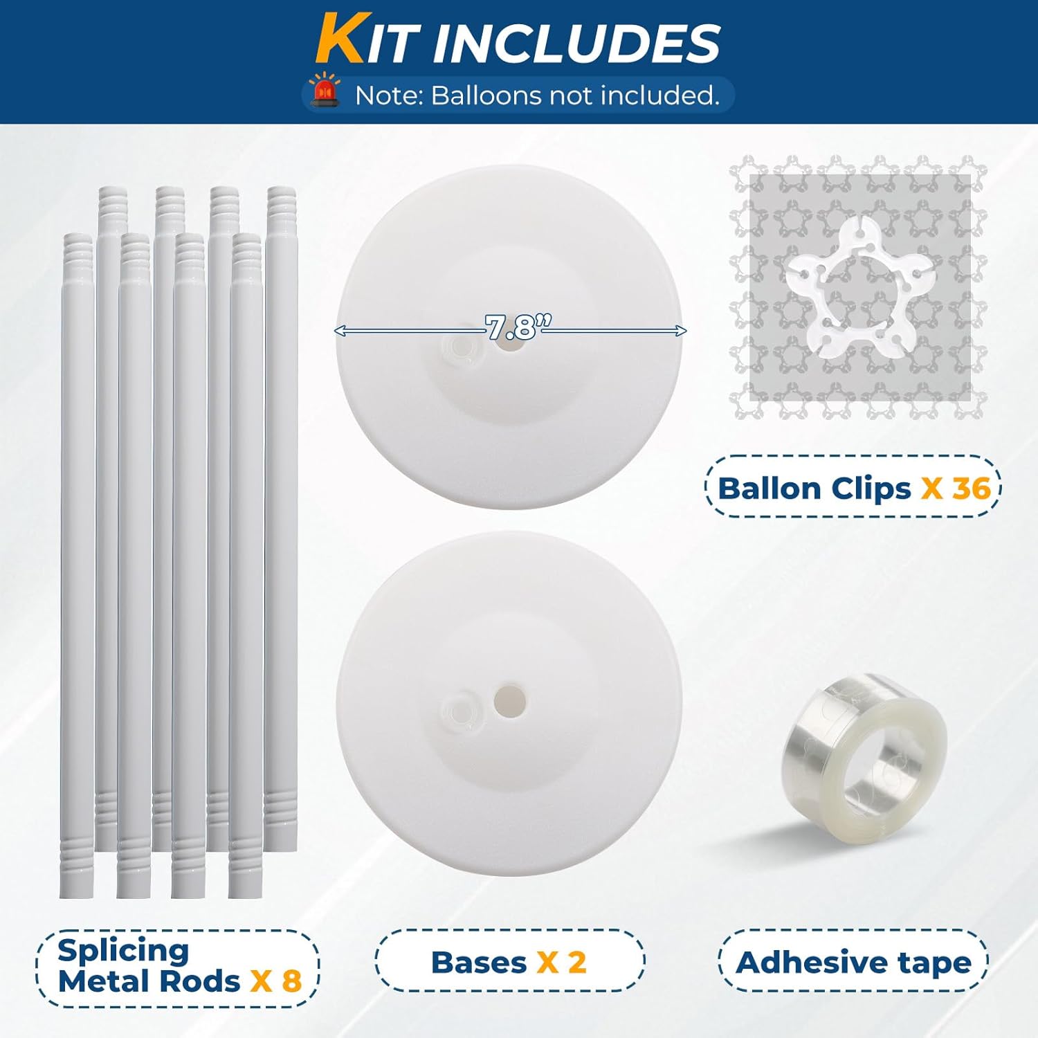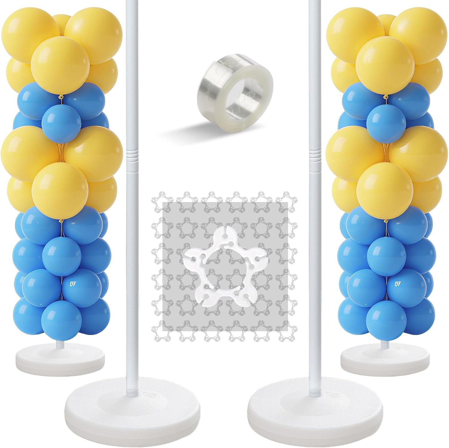 - ✅ Balloon Pillars Stand Kit Includes: 2 bases, 8 rods (each 15.7 inches long), 36 balloon clips, and 1 roll of balloon tape. Note: Balloons are not included.