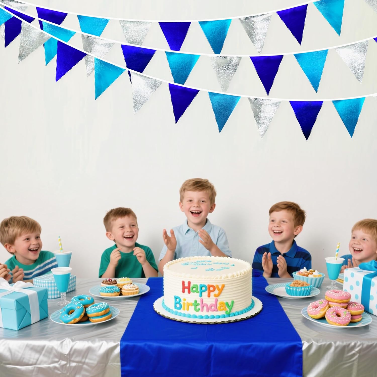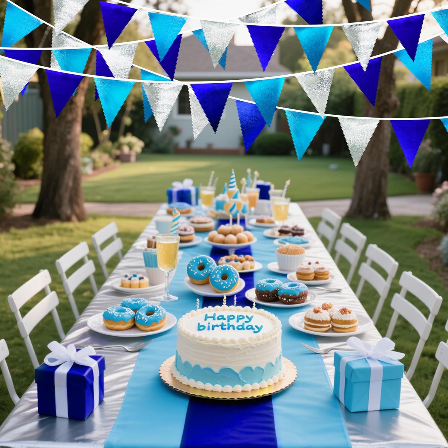 - Environmental Material - Our triangle flag banner bunting are made of double-sided sky blue、royal blue、silve metallic fabric cloth,Unique wavy neat cut,soft and comfortable touch.safe and odorless,washable and waterproof,durable and reusable.