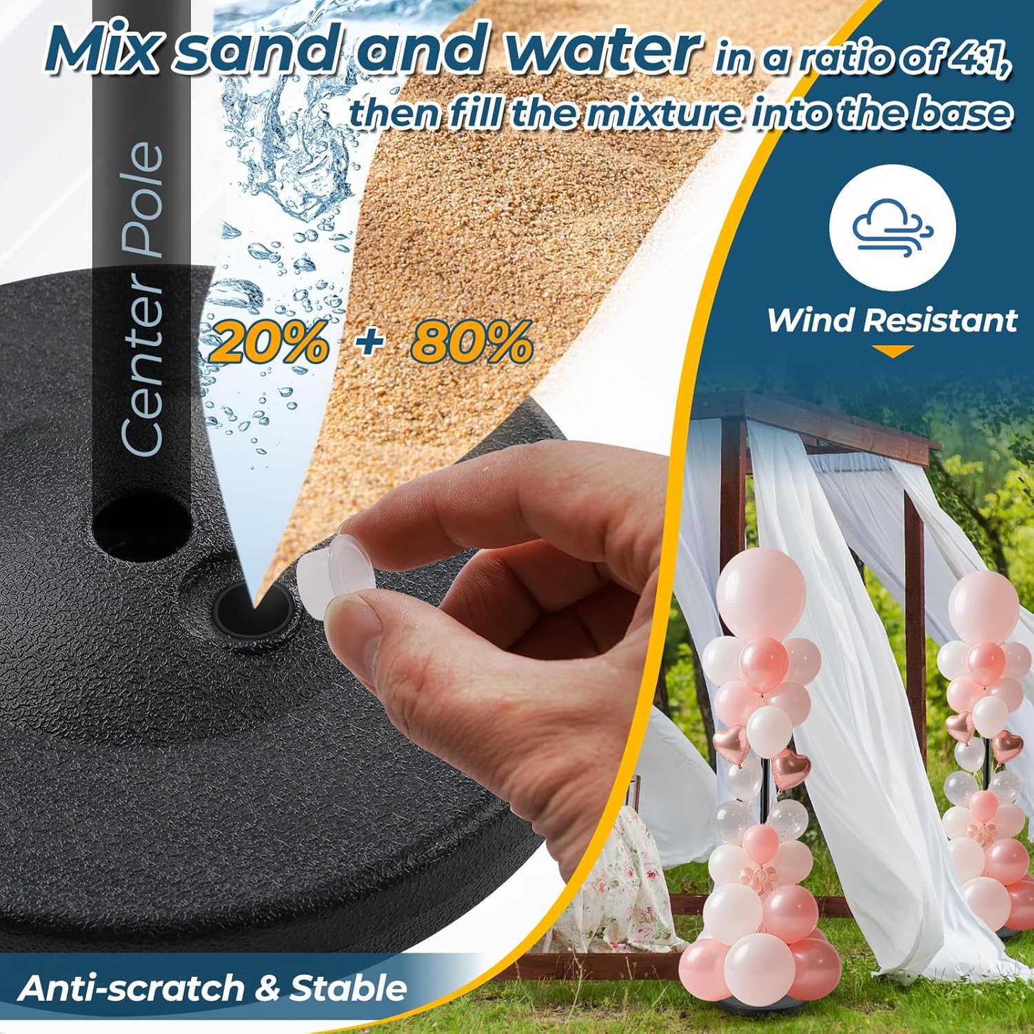 - ✅ Wind-Resistant Design: The balloon stand base is made of PVC material. Mix sand and water in a 4:1 ratio, then fill the mixture into the base to create a highly stable balloon stand.
