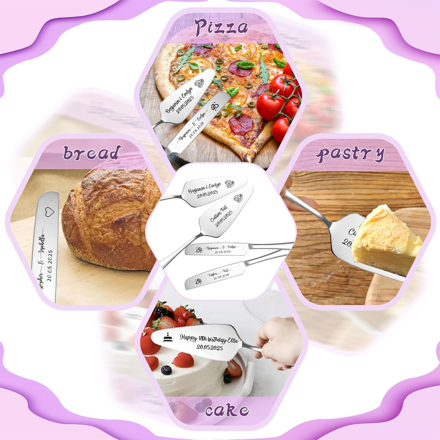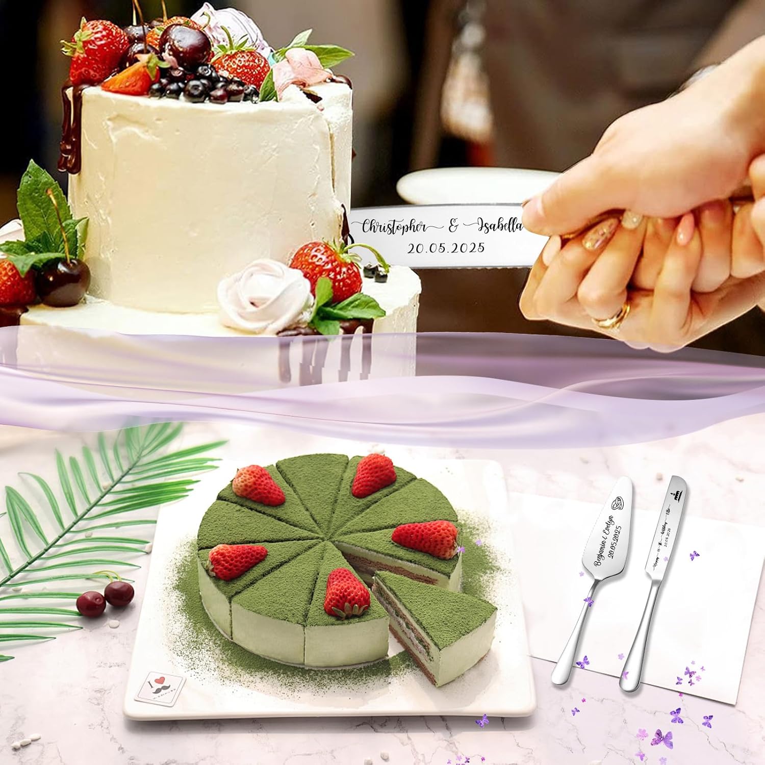 - Personalized Wedding Cake Knife and Server Set:Our wedding cake cutting set features personalized design as the core highlight, injecting a unique romantic imprint into your wedding! Using laser engraving technology, you can engrave the names of the bride and groom, wedding date, or exclusive love motto on the cake knife and server set, making the tableware an "exclusive token" that carries emotions