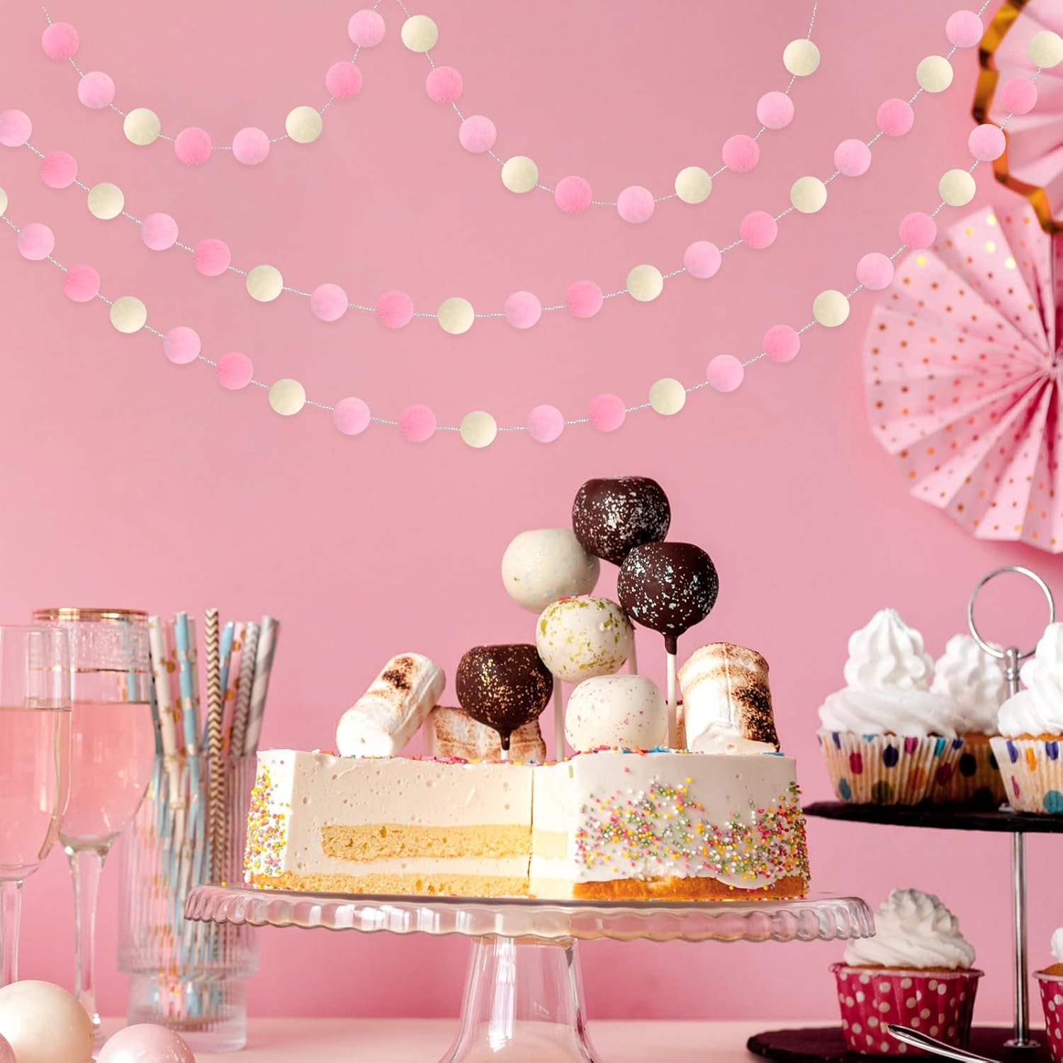 3 Pack Pom Pom Garland Colorful Felt Ball Garland Decorations, 6.5 Feet Long with 30 Balls Banner Hanging Supplies for Birthday, Baby Shower, Parties (Pink & White)
