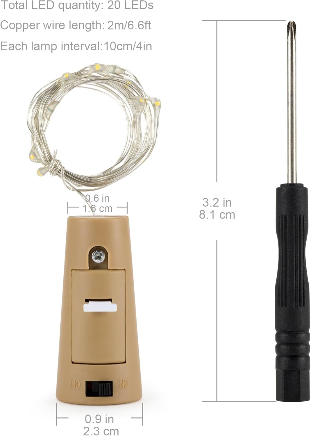 - Cork Design: The diameter of the cork is from 1.6 cm/ 0.6 in to 2.3 cm/ 0.9 in, which is the universal size for most wine bottles. This led bottle lights fits for most glass, wine, beer, soda, whiskey bottles and any other kind of bottles. Toggle the button on the cork to turn the lights on/off, easy to operate