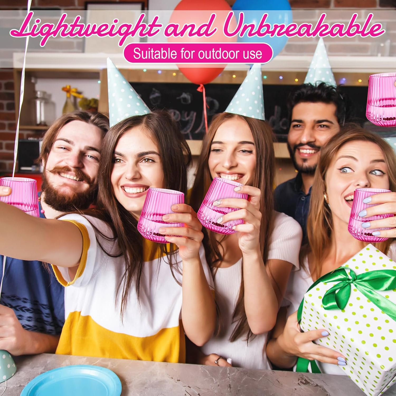 Suclain 50 Pcs Plastic Wine Glasses Ribbed Stemless Wine Glasses 14oz Vertical Design Unbreakable Cups for Outdoor Indoor Vintage Elegant Champagne Whiskey Cups for Party Wedding (Hot Pink)