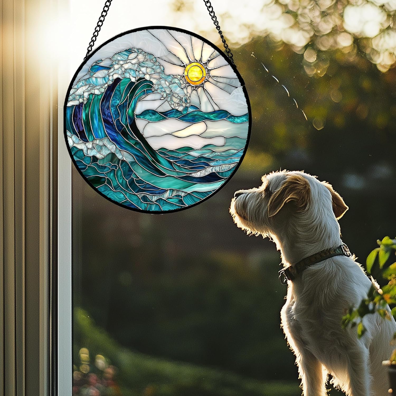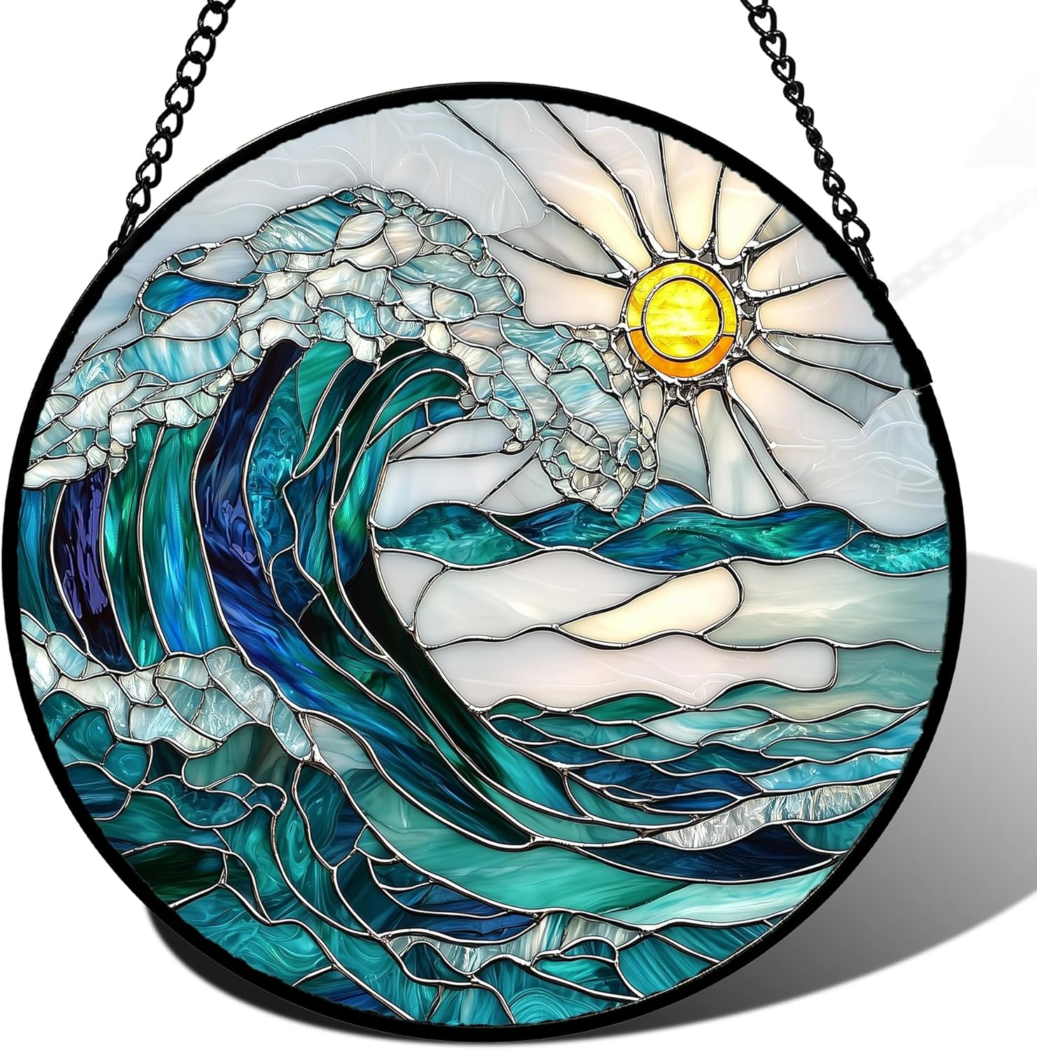 Stained Glass Window Hanging - Blue Green Waves Suncatcher for Door Terrace Garden Home Decor Sunrise Over The Sea Sun Catcher Birthday Gifts for Lovers Women Men Dad Mom Nana 9.8 in