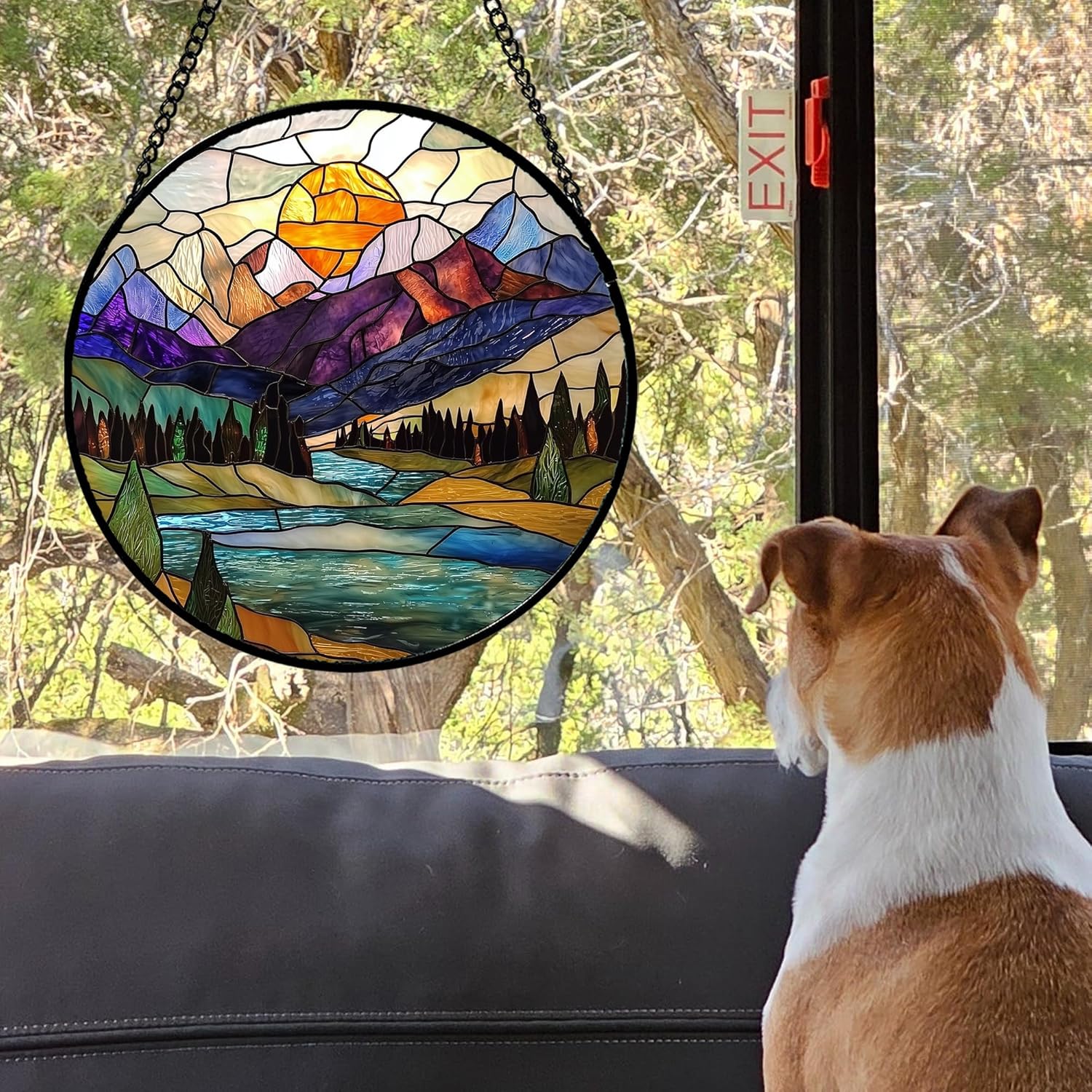 Stained Glass Window Hanging, Blue Lake Golden Sun Abstract Mountains Landscape Suncatcher for Doors Window Home Sun Catchers Decor Mother's Day Birthday Gifts for Women Men Mom 7.8 in
