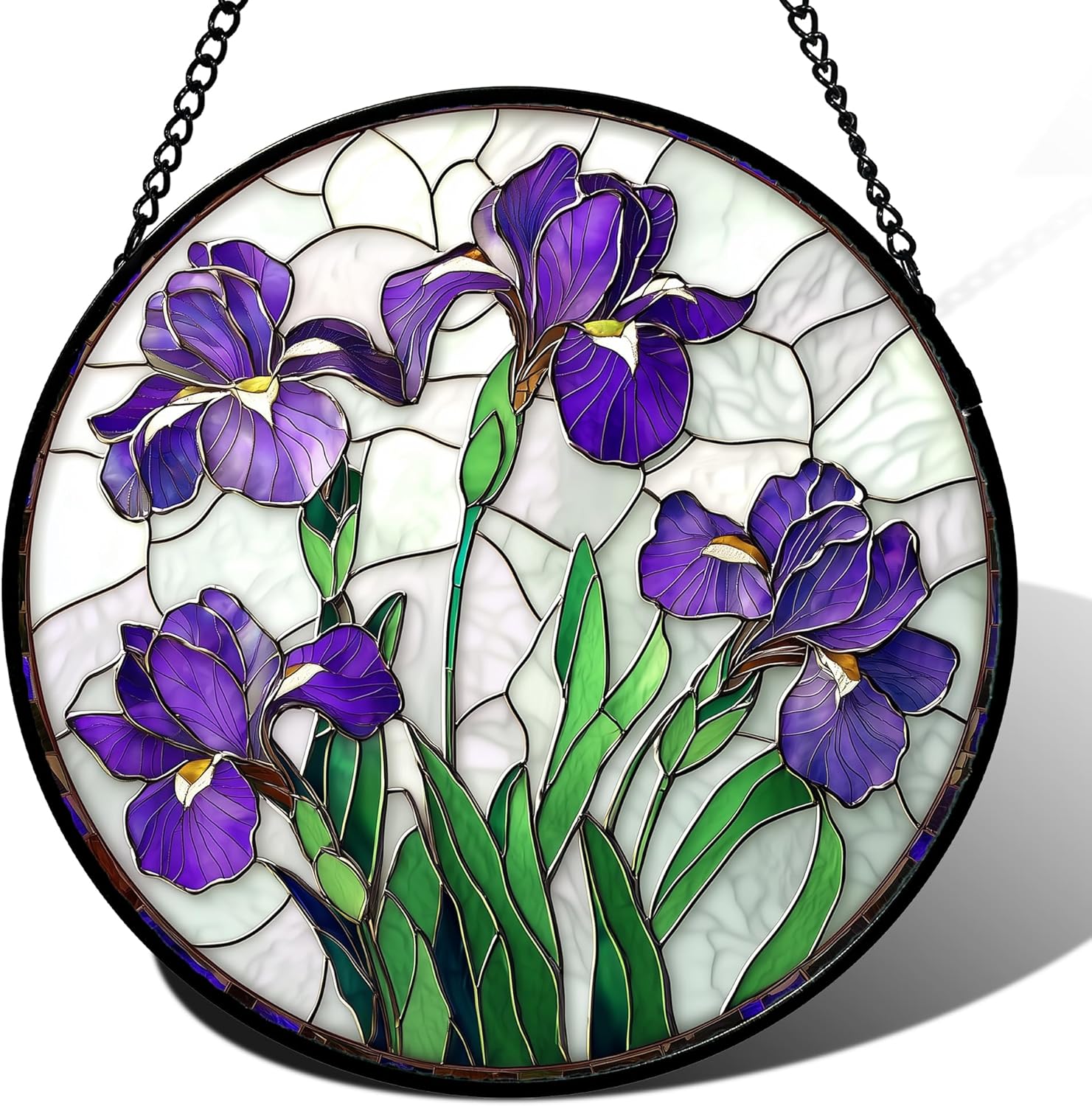 Stained Glass Window Hanging - Purple Iris Flower Sun Catcher for Door Terrace Garden Home Decor, Green Plants Suncatcher Birthday Gifts for Lovers Women Men Dad Mom Nana 6.3 in