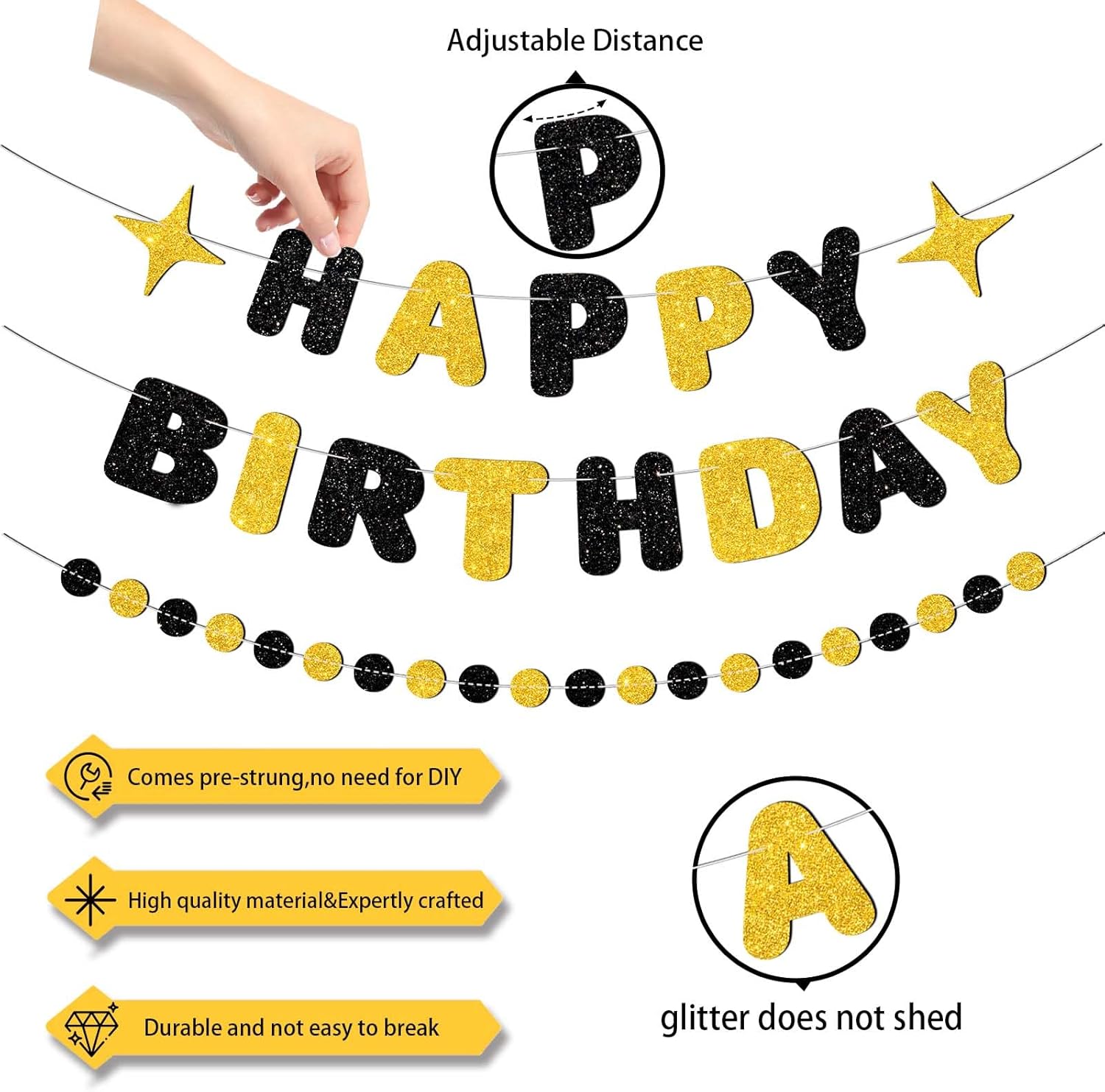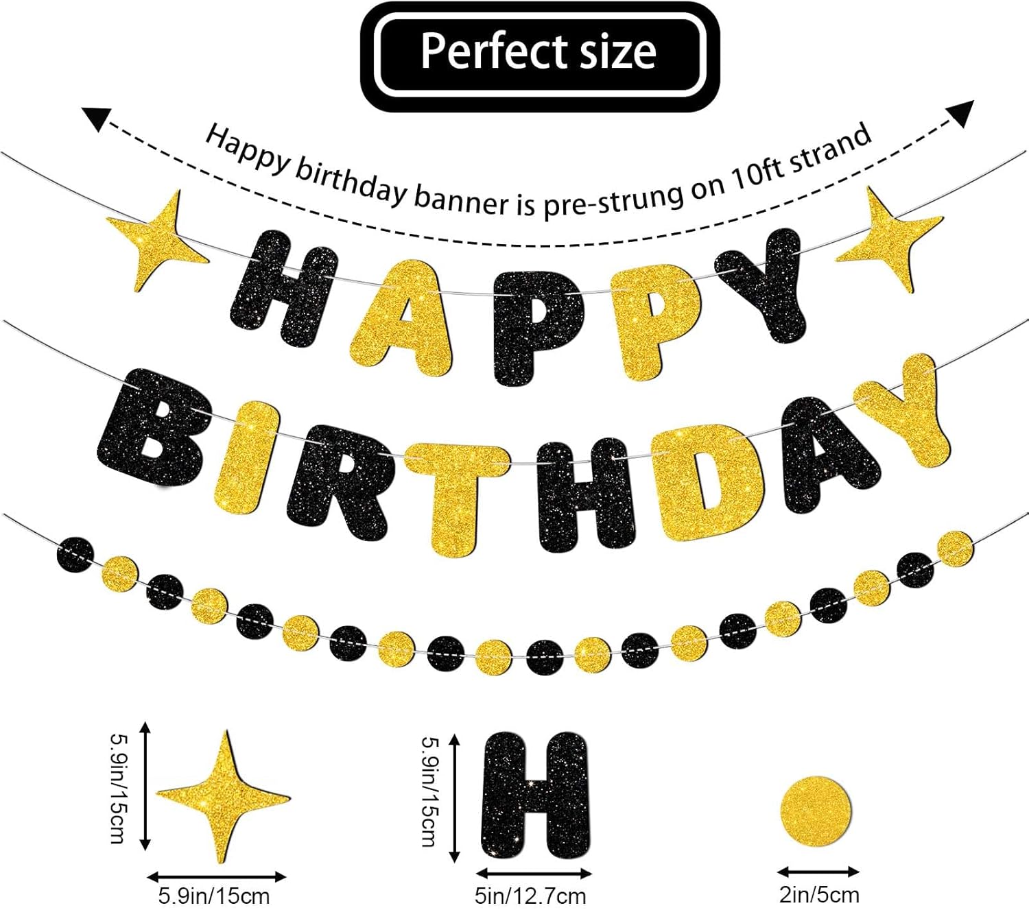 - PRE-STRUNG | NO DIY: Our happy birthday banner black and gold will arrive to you with each letter already pre-strung on a 10 ft strand,you don't have to fuss over assembly.It is easy to hang the backdrop banner.The birthday banner is large enough for birthday party decorations,black and gold birthday decorations and any other birthday decor.