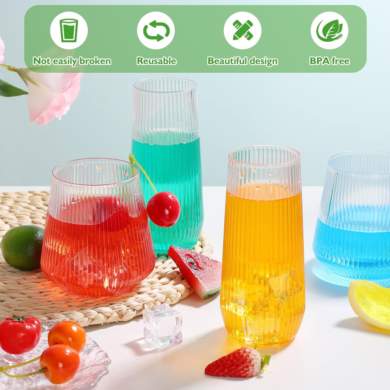 mwellewm 48 Pcs Plastic Wine Glasses Disposable Ribbed Cocktail Cups Set 9 OZ Stemless Champagne Flutes 12 OZ Origami Shatterproof Reusable Clear Party Cup for Wedding Home Office Bar Drinking