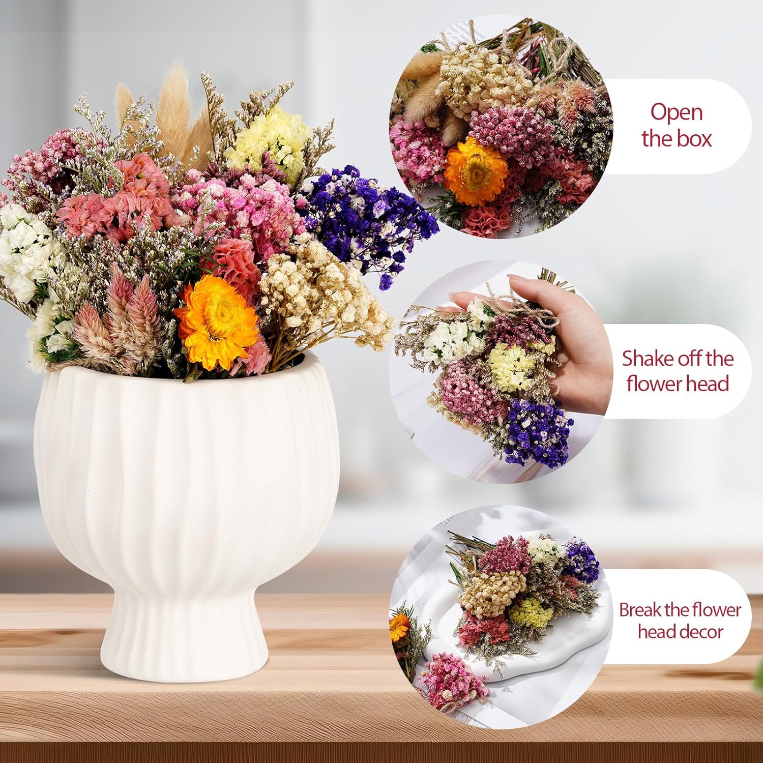- Tips: In order to maintain the best condition of dried flowers, please keep them in a ventilated and dry place, avoid exposure to the sun. Since dried flowers are made of real flowers, 5% loss may occur during transportation, which is a normal phenomenon. If you have no objection to this, you are welcome to place an order and start the natural aesthetics tour. In order to avoid losses, our products are packaged in cardboard boxes, and we do our best to give you a good experience
