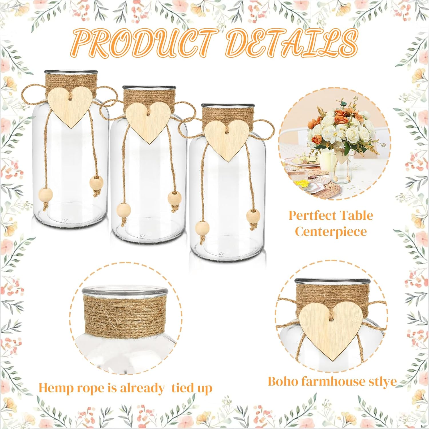 - No Assemble Required: No need to worry about tying strings. We have already tied the hemp rope, wooden pieces, and wooden beads to the bottle, so you can simply insert the beautiful flowers into the Mason jar.