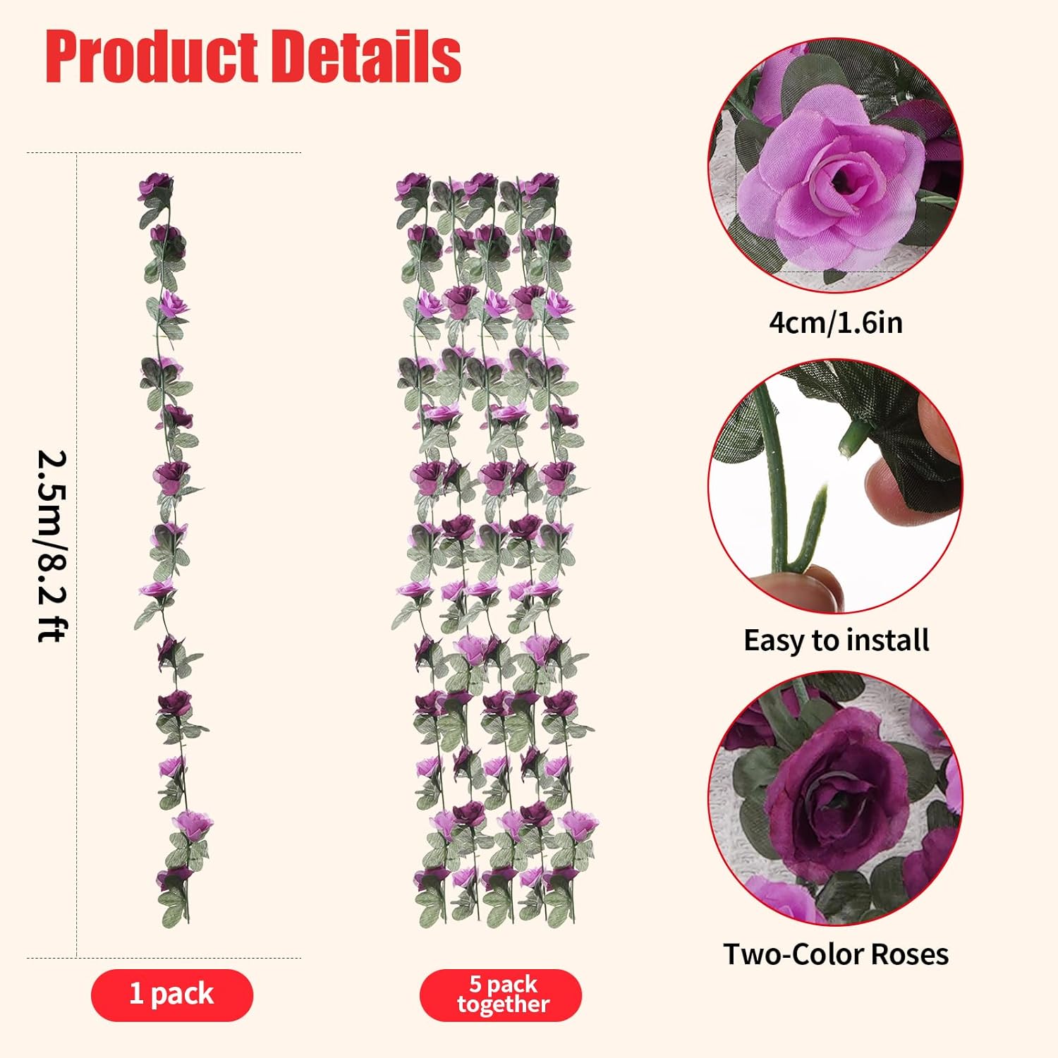 - PACKAGING: Total length 41FT, each vine 8.2FT (250CM), 5 vine plants hanging fake flower garland. Each plant has 45 flowers. Rose heads are 1.6” (4CM) in diameter. 45 leaves. These 5 rose vines are fluffy enough to decorate your room!