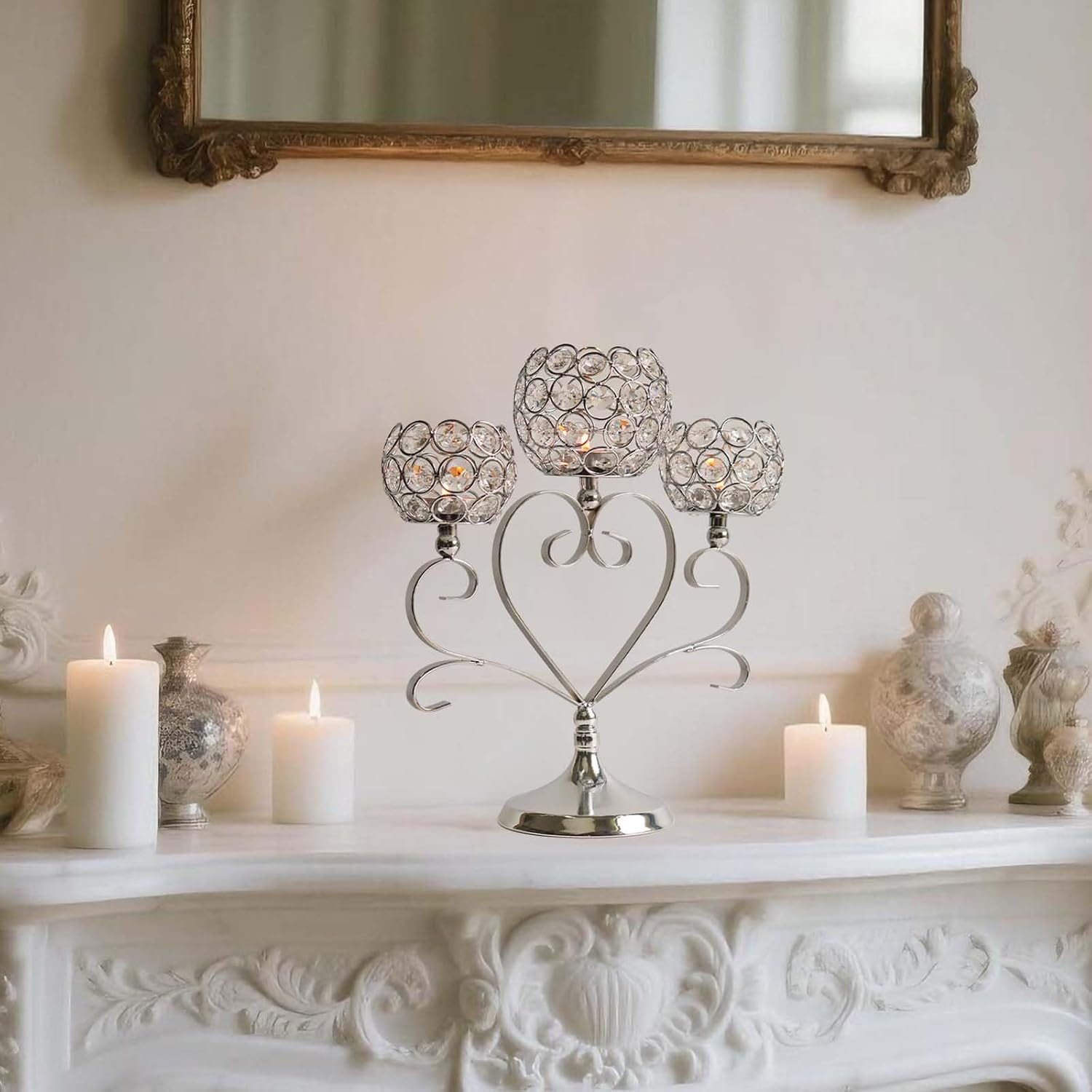 2 Pcs 3-Arm Heart Tea Light Candle Holder - Crystal & Metal Wedding Centerpiece Decor, Sparkling Table Decor for Anniversaries/Romantic Tabletop Home/Dinner Party/Events (2, Silver)