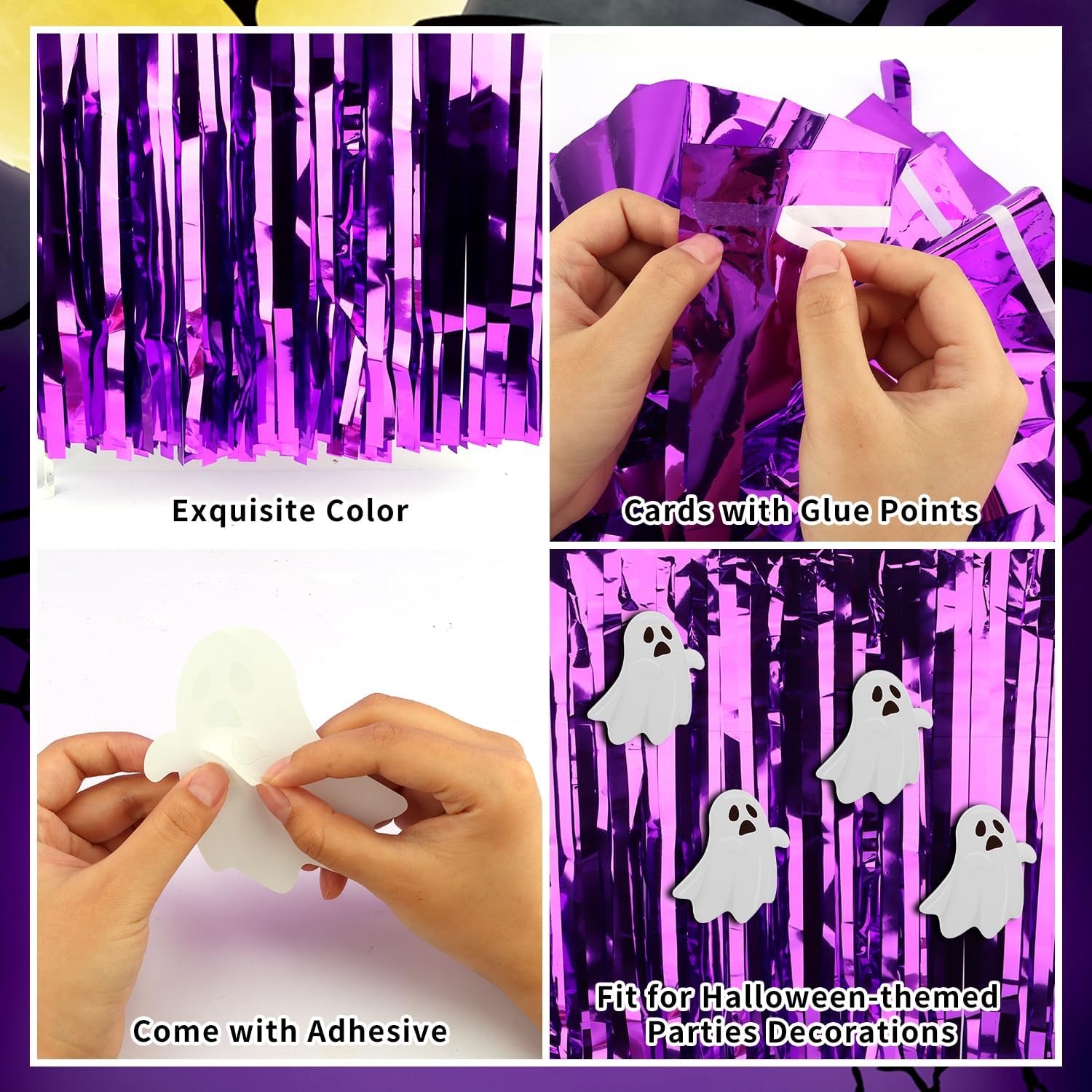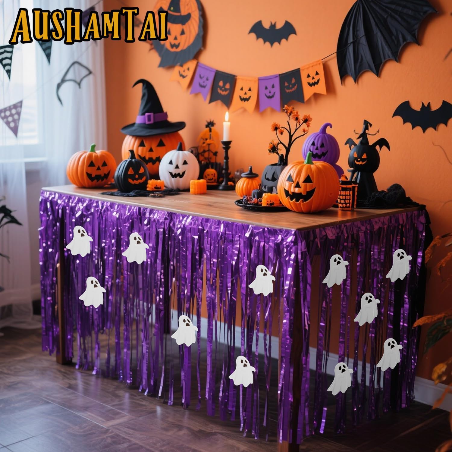 - The packaging includes: 1 pack metallic foil tassel table cover 28.74x106.3 inches, which is enough to decorate your halloween party, provide you with excellent convenient installation: the halloween table cloth is equipped with self-adhesive tape. Just tear off the tape and paste it. There are ten ghost stickers, 2.95x4.33 inches, and adhesive dots provided in the package for sticking the stickers onto the halloween tablecloth. The installation is convenient and quick. It can be pasted on the edge of your round table or rectangular table. It can be easily cut into any siz.