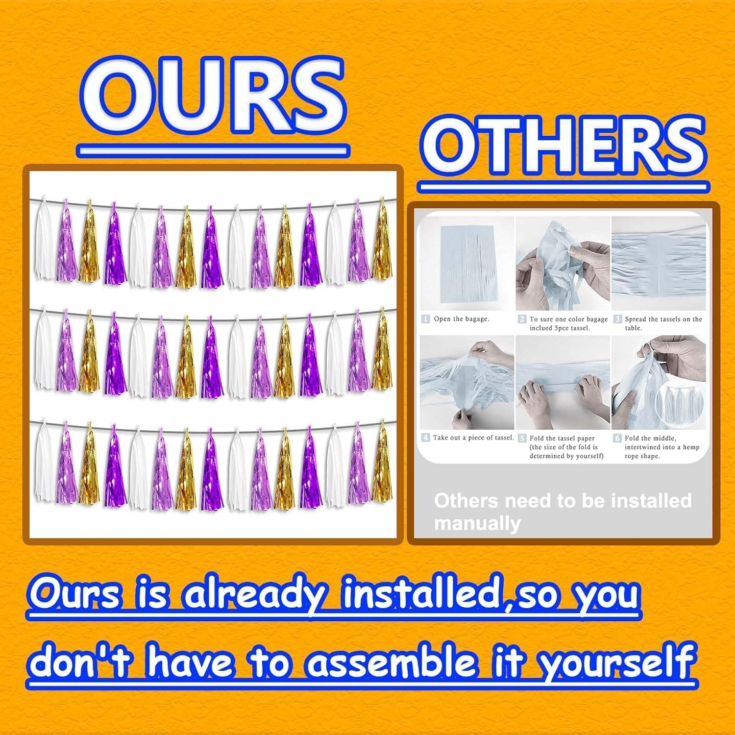 - 【Package Includes】The total length of them Purple Gold birthday tassels banner is 30 feet, divided into 3 strips, each 10 feet long. Each banner contains 15 tassels, and each tassel measures 14 inches, for birthday decorations many occasions uitable for Patriotic display, Homecoming Float, Christmas Float, ecorative metal trailers, graduation floats etc