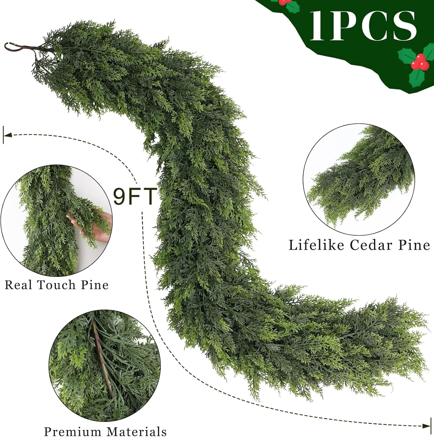 - 【Real Touch Cedar Garland】: Hand crafted with a real touch. The cedar garland is assembled from realistic pine needles, with thick and plump leaves that are lush and green, looking very natural.
