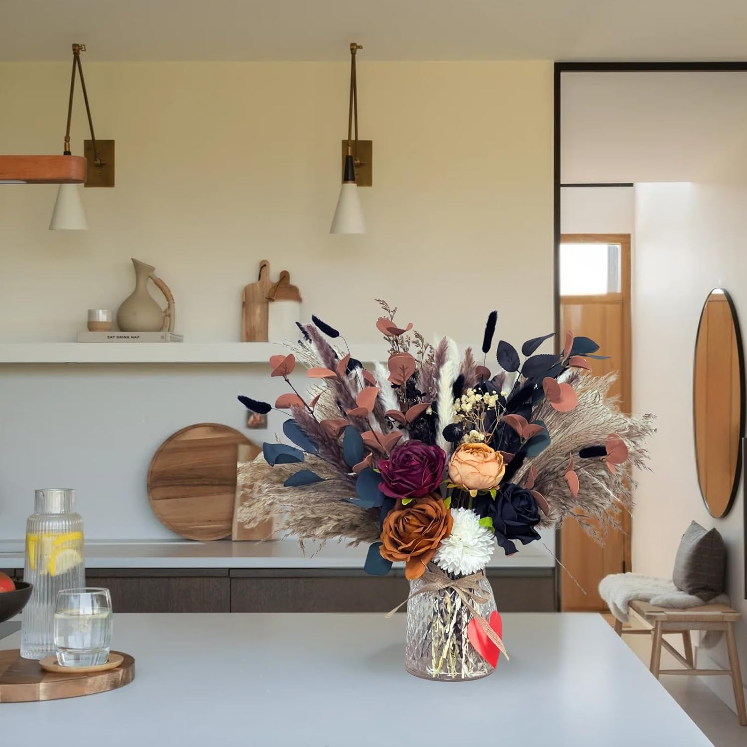 - Vibrant & Cozy Fall Centerpieces for Dining Table - This fall flower arrangements in vase features a mix of orange, burgundy, neutral, and black flowers & pampas grass, picks foliage and stems, ideal as fall centerpieces for dining table. Perfect for thanksgiving table decorations or christmas centerpieces for dining table, it enhances dining room table centerpiece decor and fits any space, from living room to kitchen.