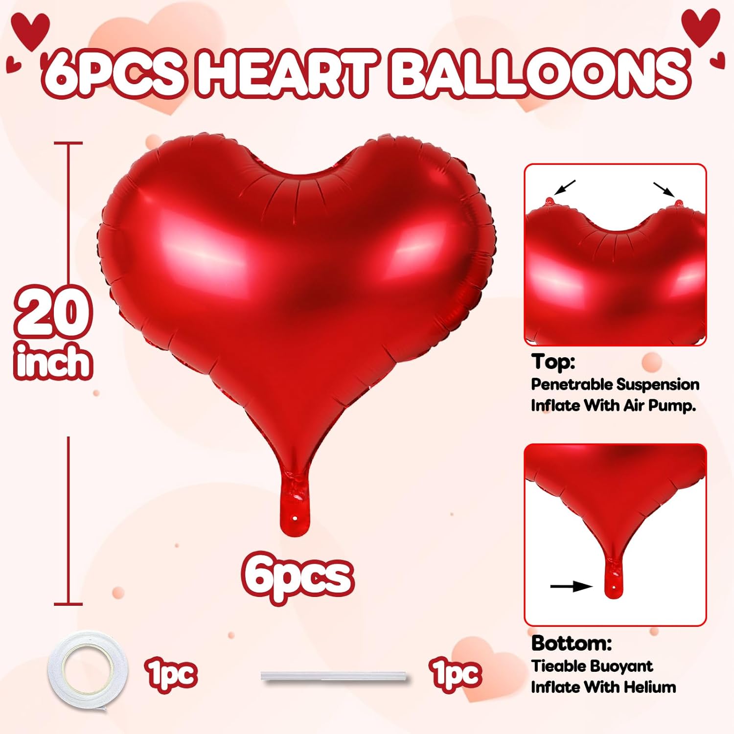 - 20 Inches Heart Balloons - Package contains 10 pcs red heart balloons, 1pc straw and 1pc ribbon.The red heart shaped balloons are ideal for any party. 20 inch is big and special enough to decorate your party and create a sweet and warm atmosphere!