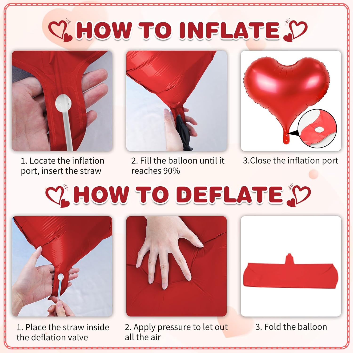 - Easy to Use - Effortlessly inflate our heart shaped foil balloons using the included straw. (If you want a floating effect, you can use helium)Simply pinch the self-sealing valve when full. It can be easily hung on the wall, ceiling or balloon garland, and it looks more advanced as a photo-taking tool!
