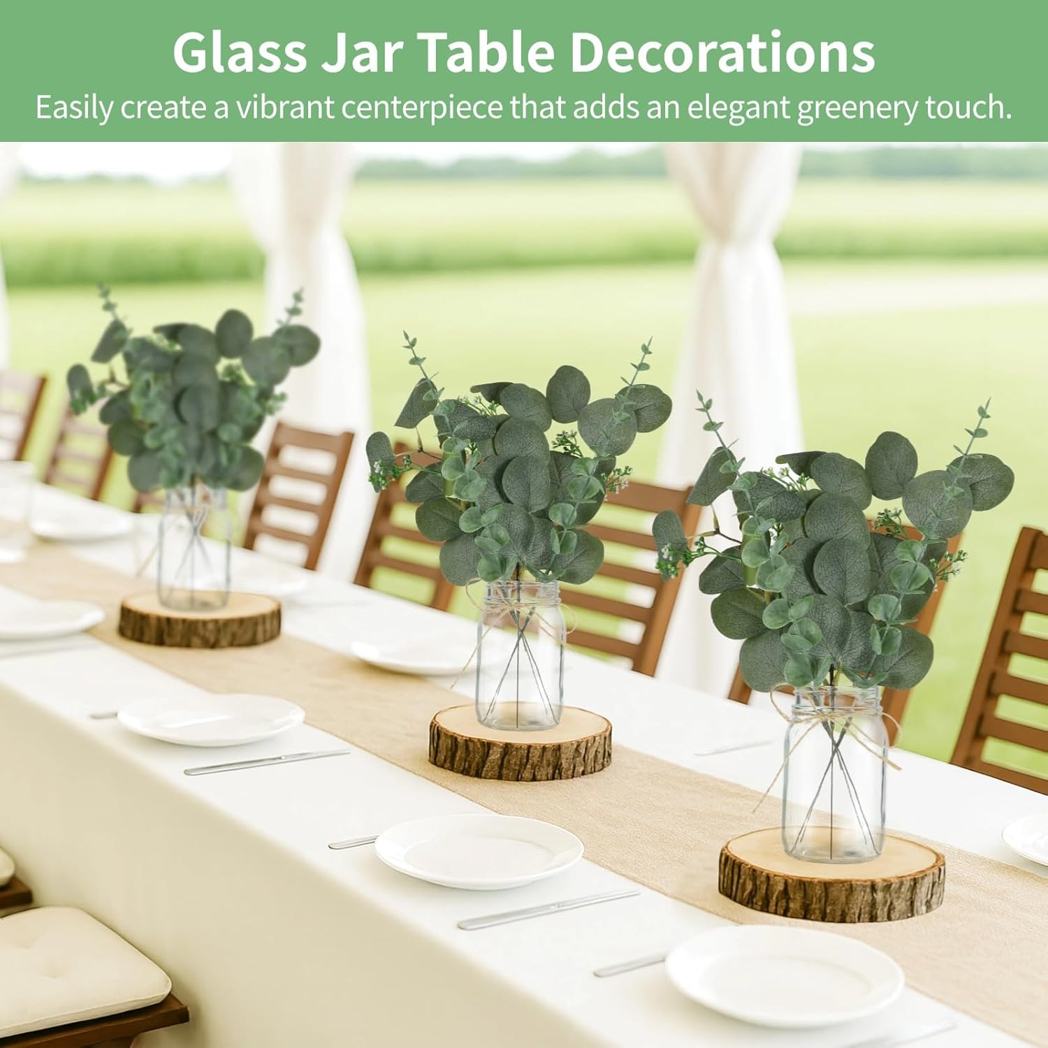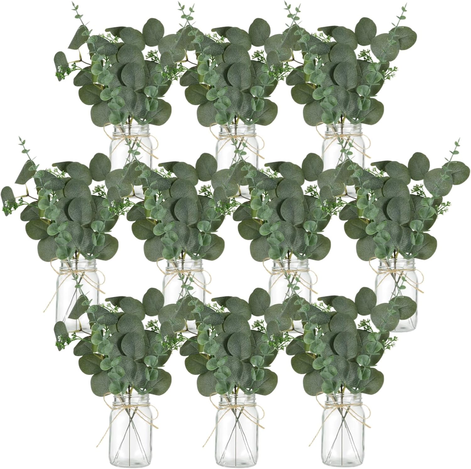 - Instant Centerpieces for Tables: 10 clear glass mason jars 17 oz with rope plus artificial eucalyptus and gypsophila ready for wedding table centerpieces reception table decorations and everyday home decor
