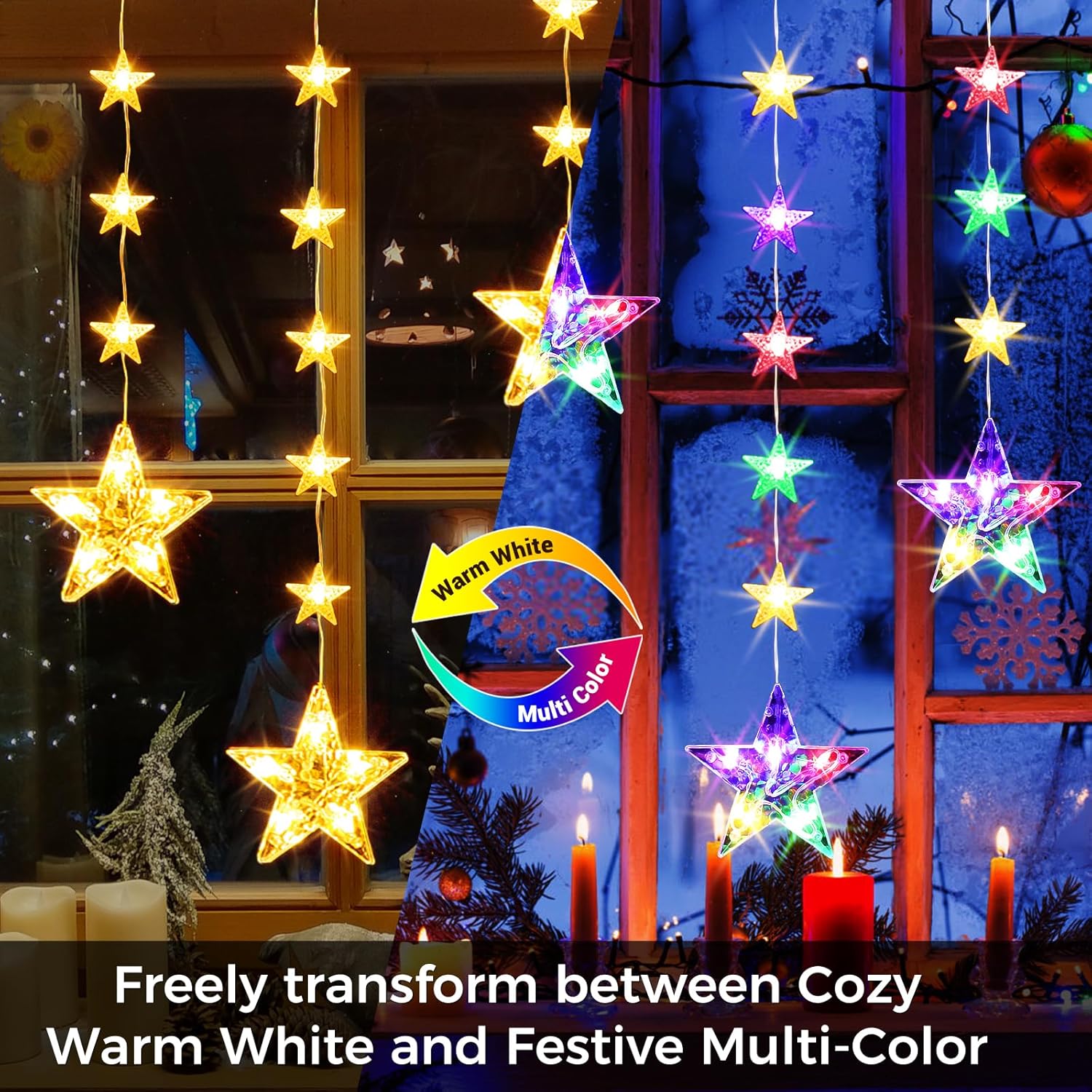 - 【8 Lighting Modes with Warm White & Multicolor】Savor the freedom of choice with seamless switching between warm white and vibrant multicolor! Our Christmas star lights offer 8 stunning lighting modes: Steady A & B, Flashing A & B, Slow Fade A & B, Color Changing Flashing and Color Changing Slow Fade. Perfectly set the mood for any occasion, from a cozy family night to a festive holiday party, making these star window lights the ultimate versatile choice for your Xmas lighting display.