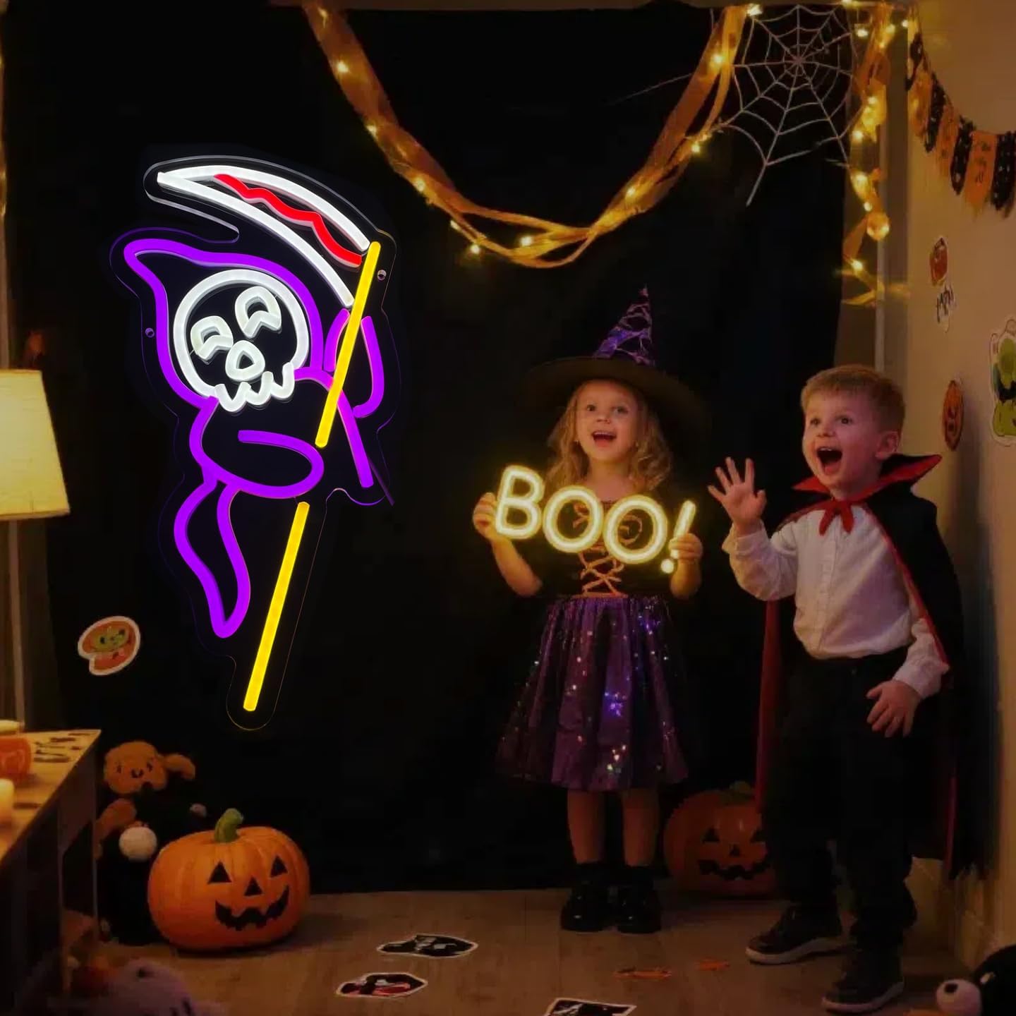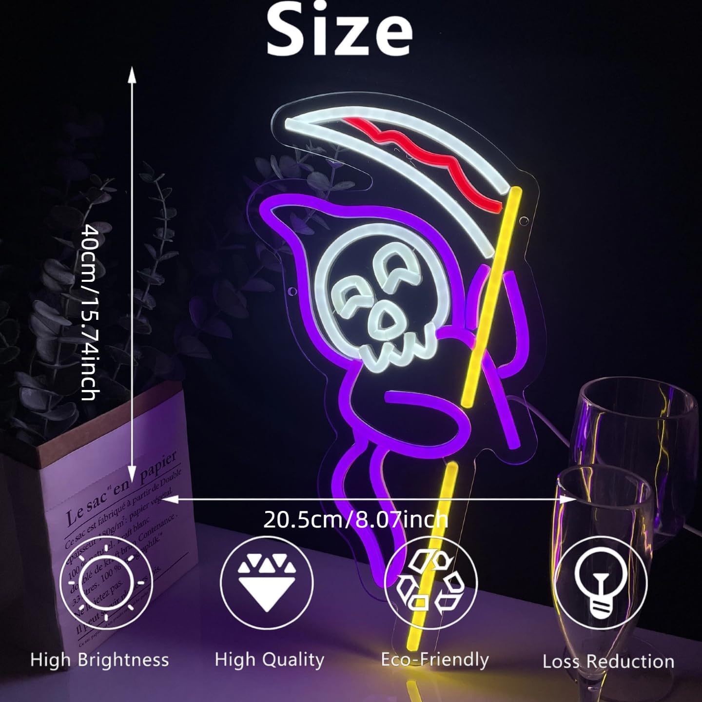 - HALLOWEEN Grim Reaper NEON SIGNS: Halloween Grim Reaper neon sign is a beautiful bedroom wall decoration with a unique Halloween theme design and scary colors, creating a Halloween spooky effect and festive atmosphere.