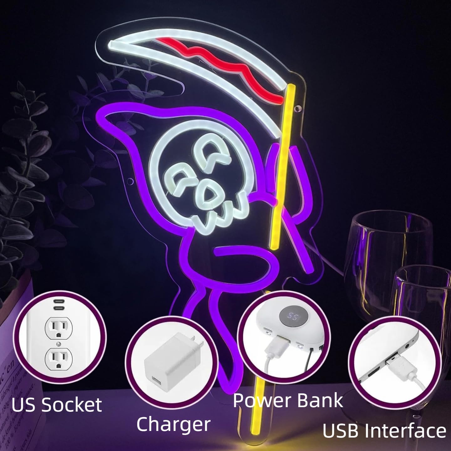 - USB POWERED: The Halloween Grim Reaper neon lights are powered by USB, portable and convenient. It can be connected to a power bank, laptop, computer, etc., and it can be continuously lit anywhere.