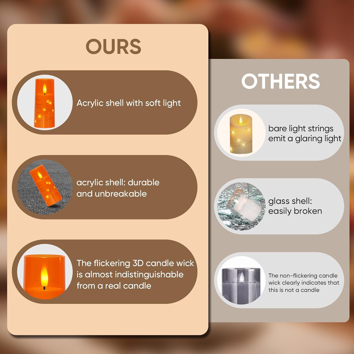 Raycare Flameless Candle with Remote Timer – 9 Flickering Acrylic Battery Operated LED Pillar Candles with Embedded Star String for Halloween, Home Decor, and as a Gift (Orange)