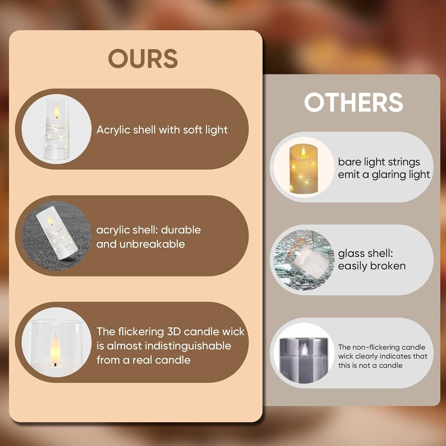 - 【Safe & Flameless】: These flickering Flameless candles offer the beauty of traditional candles without the risk of an open flame. Enjoy peace of mind as they provide a safe option, especially in homes with children or pets where you don't have to worry about fire.