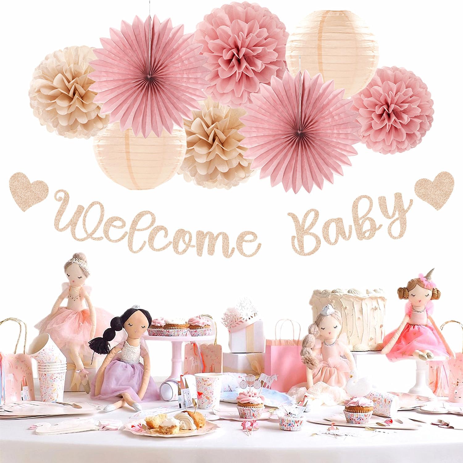 - 【Package Content】 Blush pink rose gold fall baby shower party decorations contains: 1 pcs welcome baby streamers banner sign, 1 pcs circle dots paper banner, 2 pcs paper lanterns, 4 pcs tissue paper pom poms, 2 pcs paper fans, 6 paper swirls and 15 pcs tassel garland, total 31 pcs in 8 10 12 inch and blush pink rose gold color.