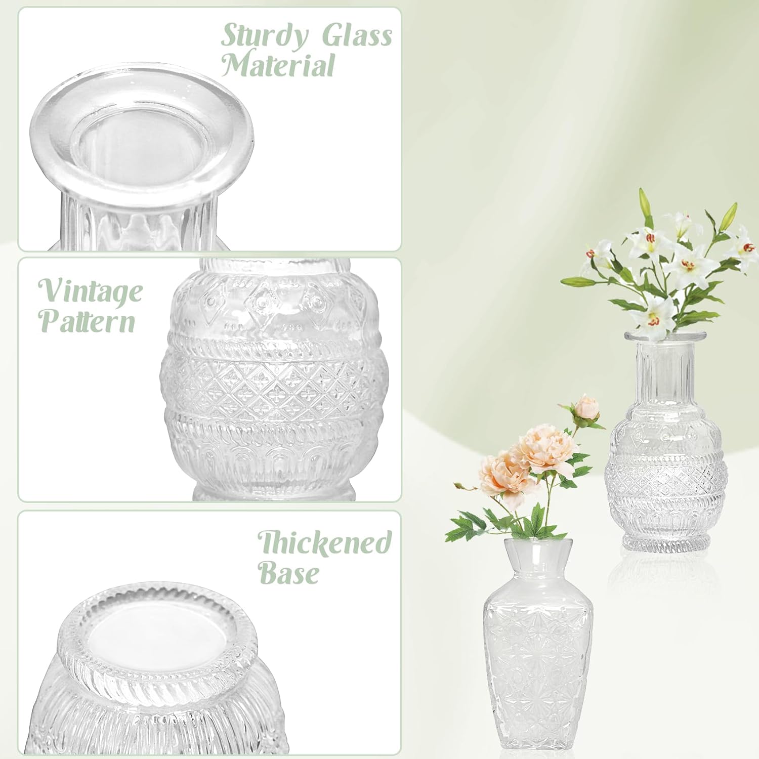 - Vintage Rustic Design: this 12pcs mini glass bud vases set with the unique design style,and each small vase is crafted different exquisite pattern,which are both simple and fashionable.The different designs,heights, and shapes make this collection interesting when you use it in the different event or home decor