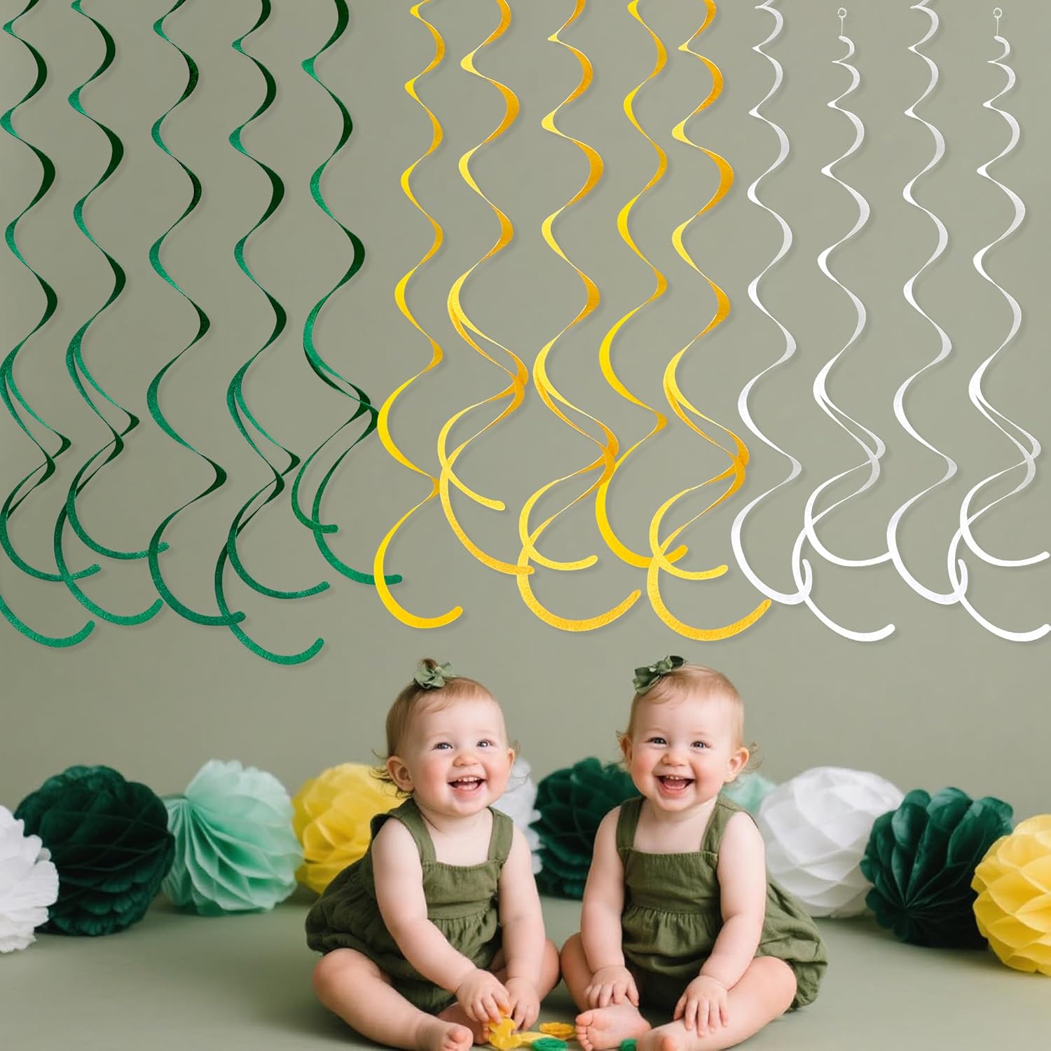 36 Pcs Green Yellow White Hanging Swirl Decorations Felt Swirl Streamer Spiral Ceiling Garland Banner for Graduation Birthday Wedding Retirement Baby Shower Spring Summer Garden Party Decor Supplies