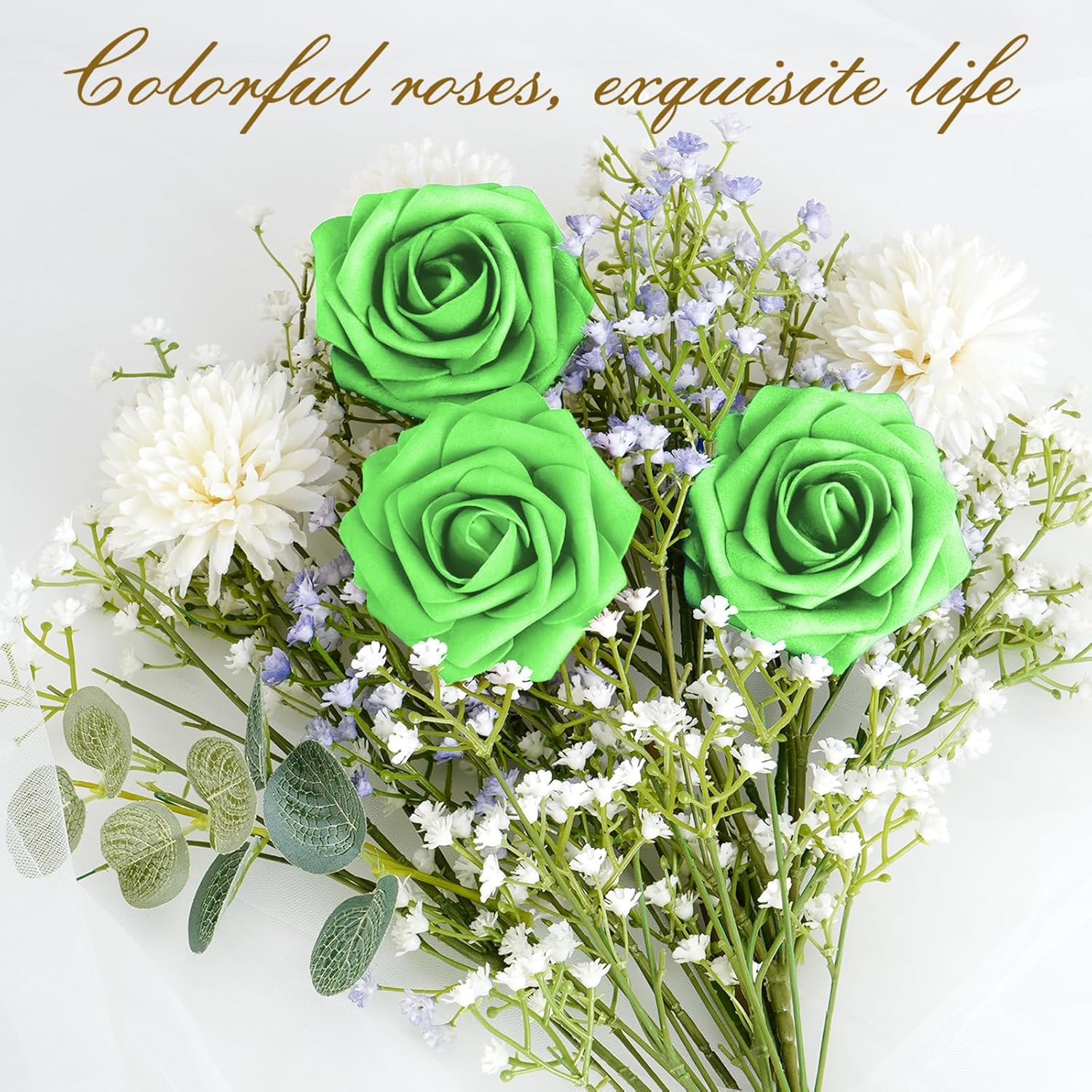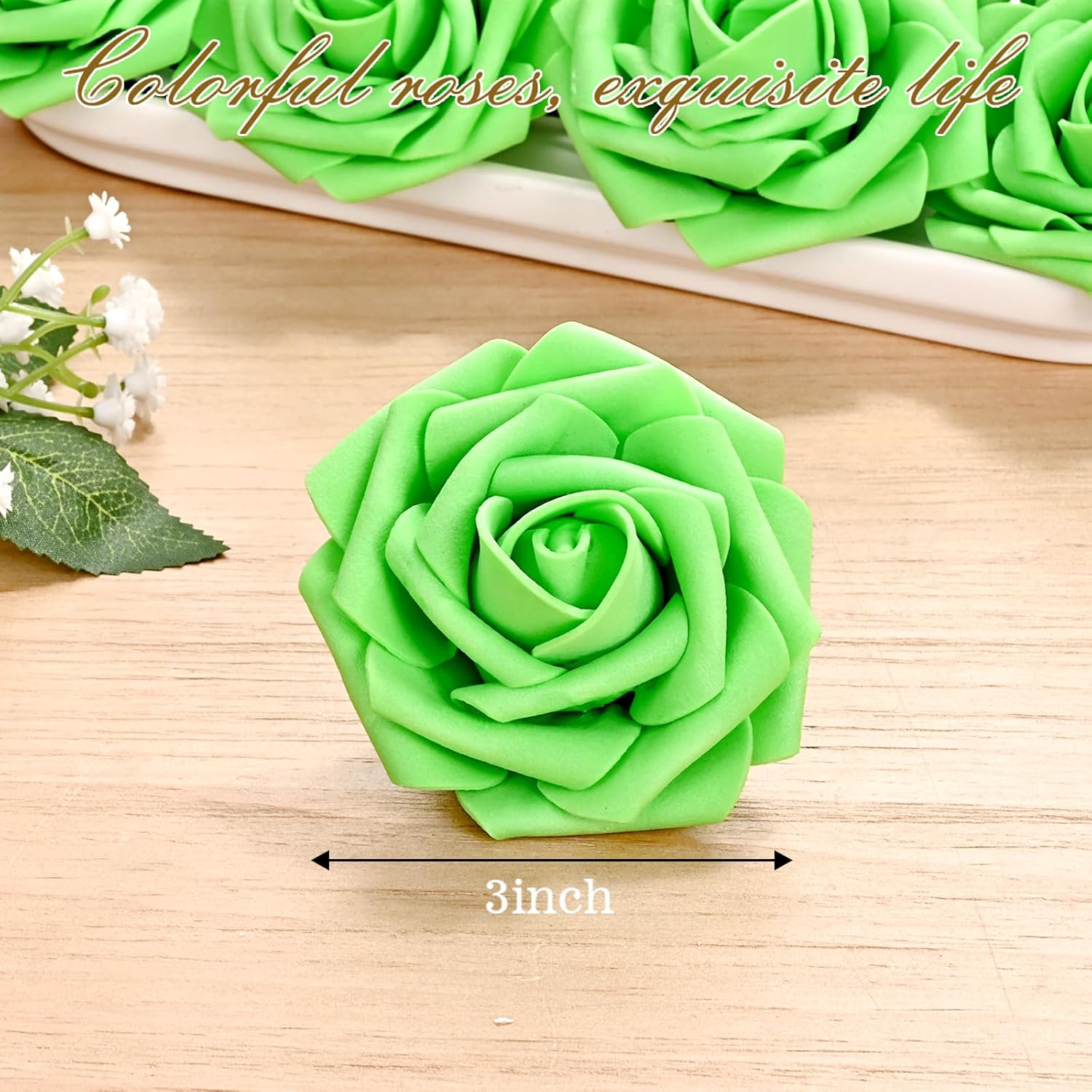 - Kindle Your Creative Flames: The box includes 16 bright green roses (3" flower head, 8" stem) and 4 green rose leaves, perfect for an array of DIY crafts. Whether creating wedding bouquets, graduation or birthday party ornaments, baby shower decorations, or cake adornments, our faux roses add a touch of class to every important moment.