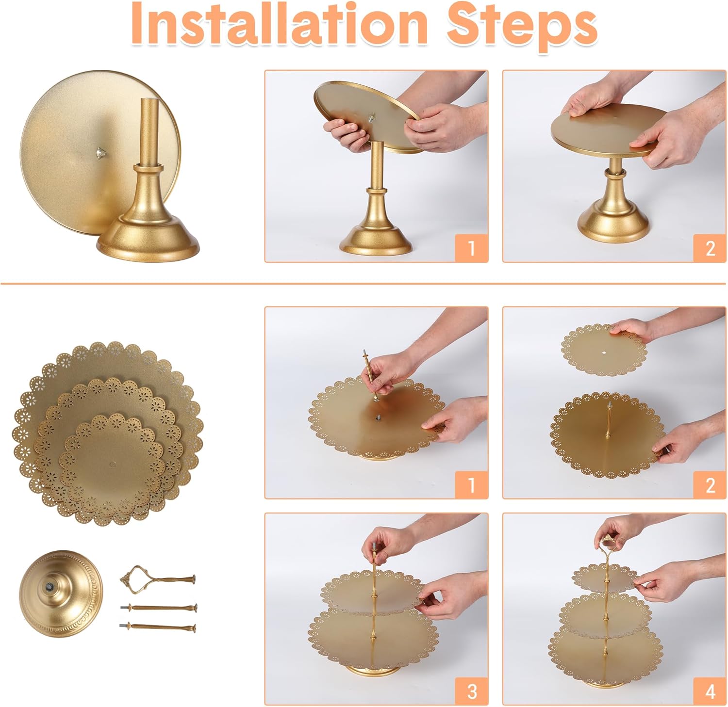 - Effortless to Assemble & Clean: No extra tools needed! Simply attach the base to each plate for fast assembly. Disassemble quickly after use for easy, thorough cleaning. Wipe the gold cake stand set with a damp towel to keep it sparkling, and easily store them for your next event