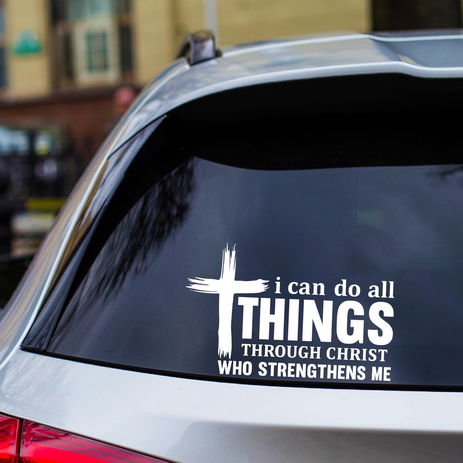 - Bible Verse Faith Sticker: Features Philippians 4:13 – “I can do all things through Christ who strengthens me” – in bold white vinyl. A timeless reminder of strength and faith for believers of all ages.