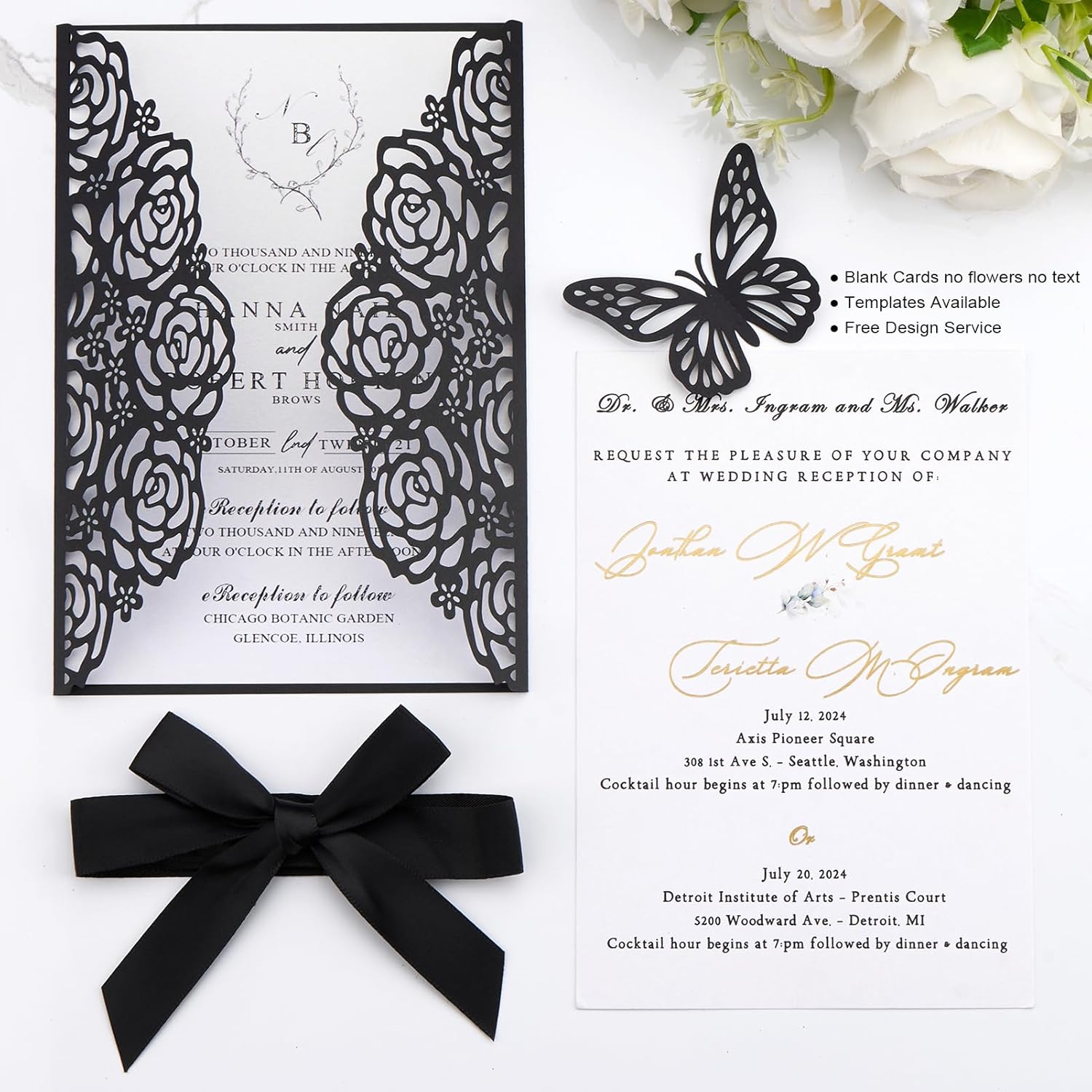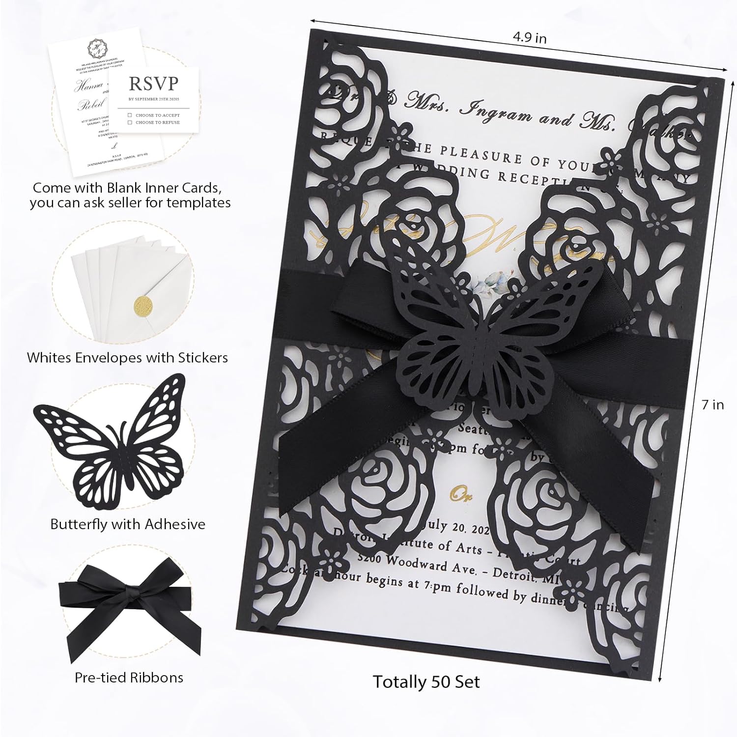 - Wedding Invitation Accessories: 50 x black invitation sleeves laser cutting, 50 x totally blank invitations cards, 50 x totally blank RSVP cards, 50 x butterflies with adhesive, 50 x ribbons, 50 x invitation envelopes & seal.