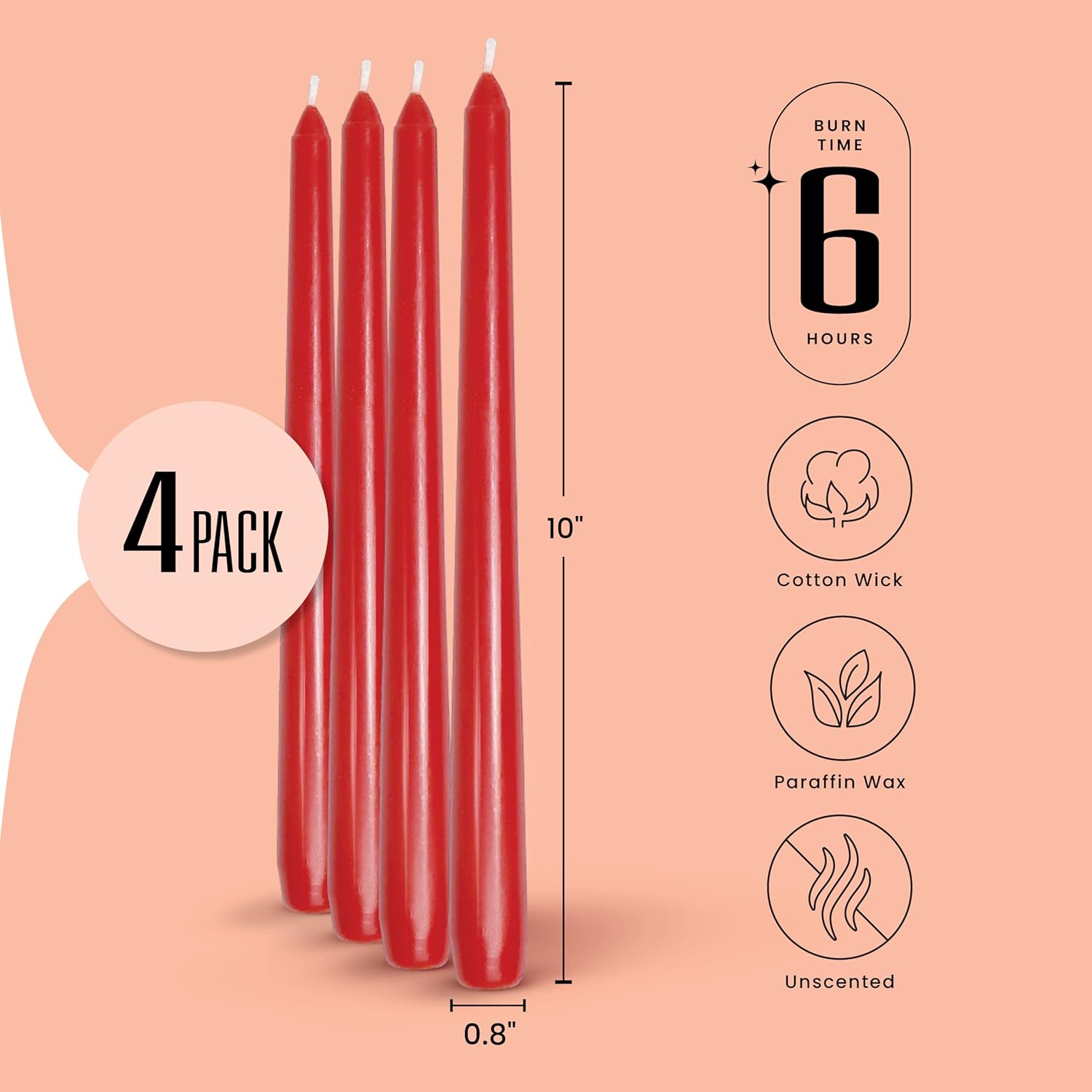 Leor & Lair Red Taper Candles - 4 Pack 10" Christmas Candlesticks - Unscented Long Burning Red Candles for Valentine’s Day, Christmas, Dinner Table, Weddings, Restaurants & Business Events