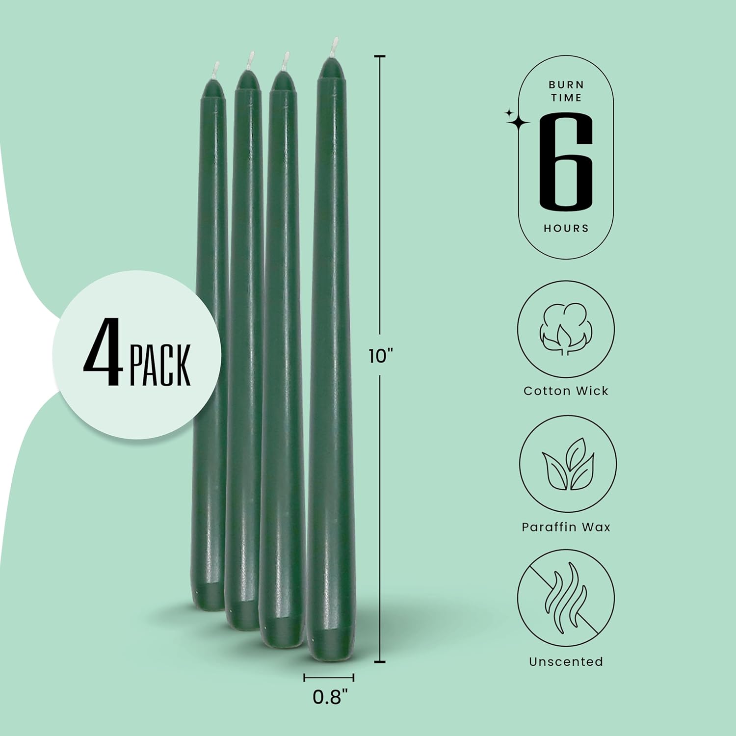 - Long-Burning Green Tapered Candles – Each 10” taper burns up to 6 hours unscented, providing steady light for Christmas tables, Easter brunches, or daily family dinners where dark green candle sticks add a touch of nature-inspired beauty.