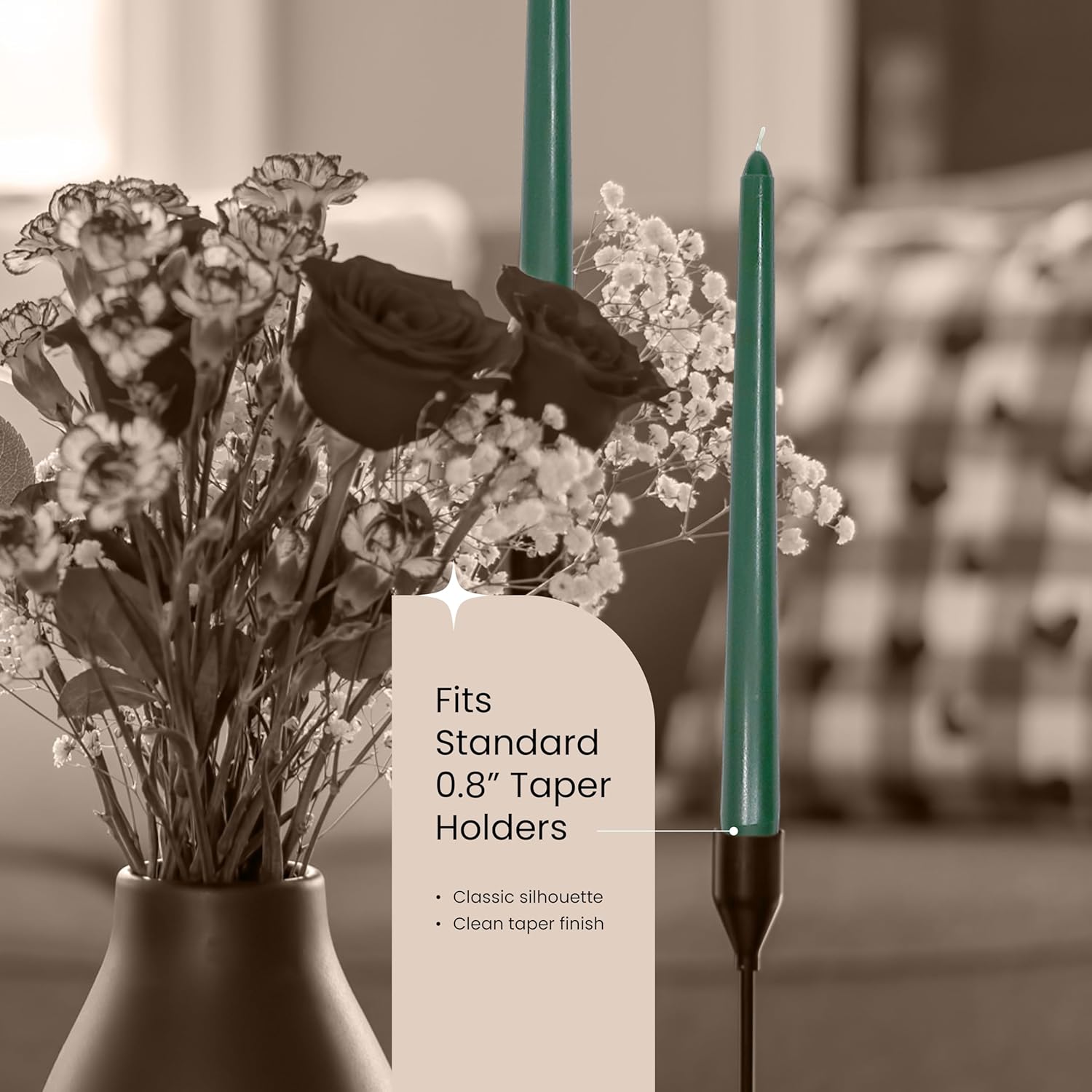 - Classic Base for Secure Fit – Designed with a tapered 0.8” base, each green candle stick fit most standard candlesticks, making them reliable for dining tables, mantels, or outdoor patio centerpieces.