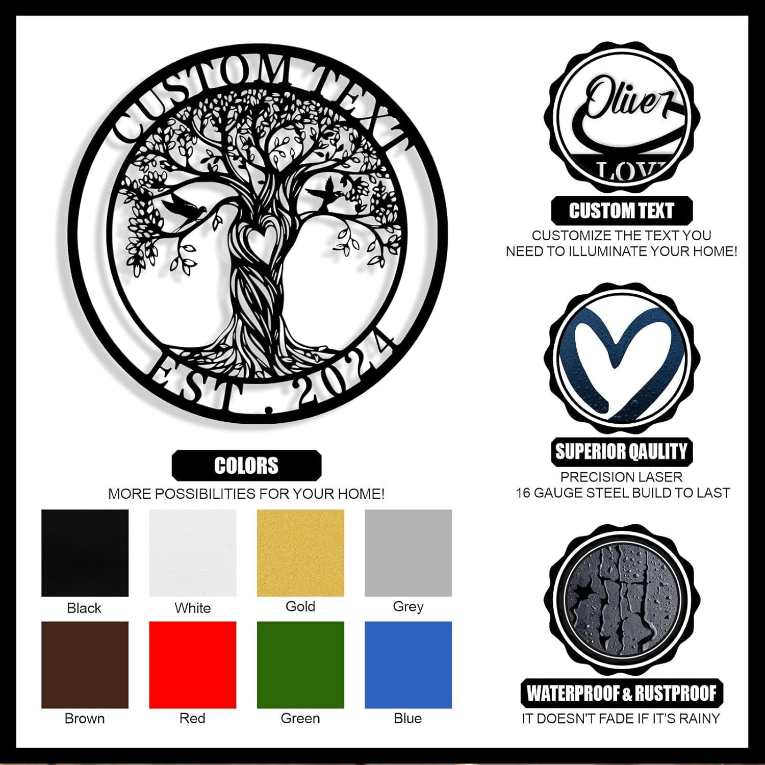 - Sturdy Material -- Our custom tree of life metal sign is crafted from sturdy 16 gauge steel with unique laser technology. The custom signs are powder coat finished. The surface is smooth, free of burrs, waterproof, anti-fading, can keep it use for years.