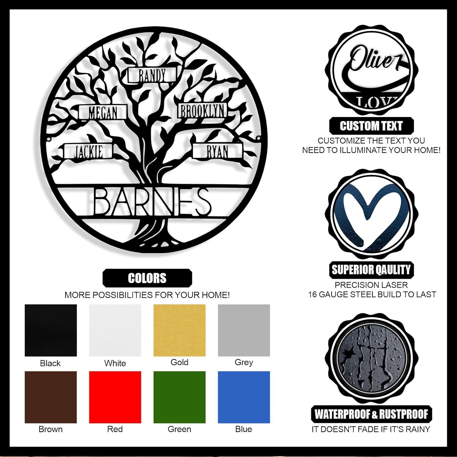 - Sturdy Material -- Our custom tree of life metal sign is crafted from sturdy 16 gauge steel with unique laser technology. The custom signs are powder coat finished. The surface is smooth, free of burrs, waterproof, anti-fading, can keep it use for years.