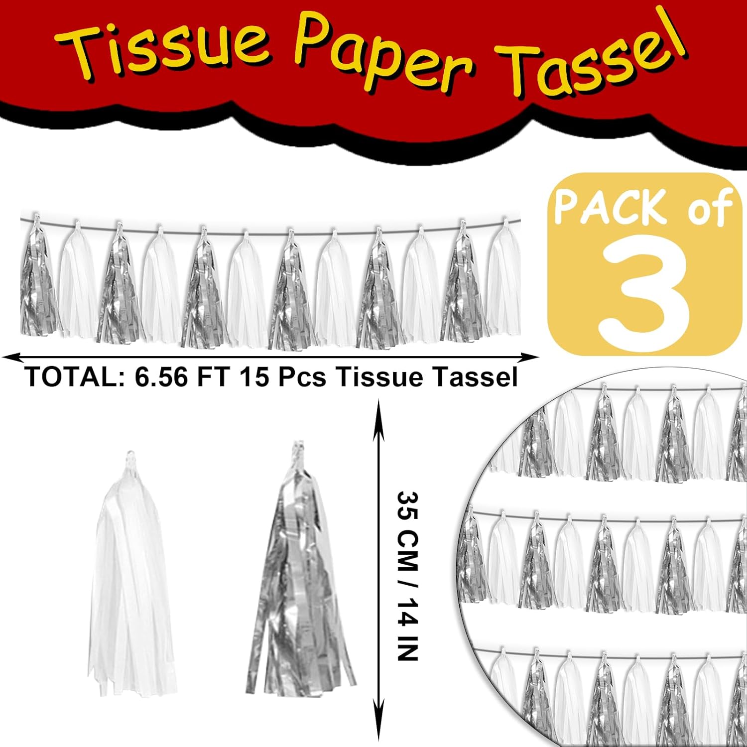 - 【Package Includes】The total length of the silver white birthday tassels banner is 30 feet, divided into 3 strips, each 10 feet long. Each banner contains 15 tassels, and each tassel measures 14 inches, for birthday decorations many occasions uitable for Patriotic display, Homecoming Float, Christmas Float, ecorative metal trailers, graduation floats etc
