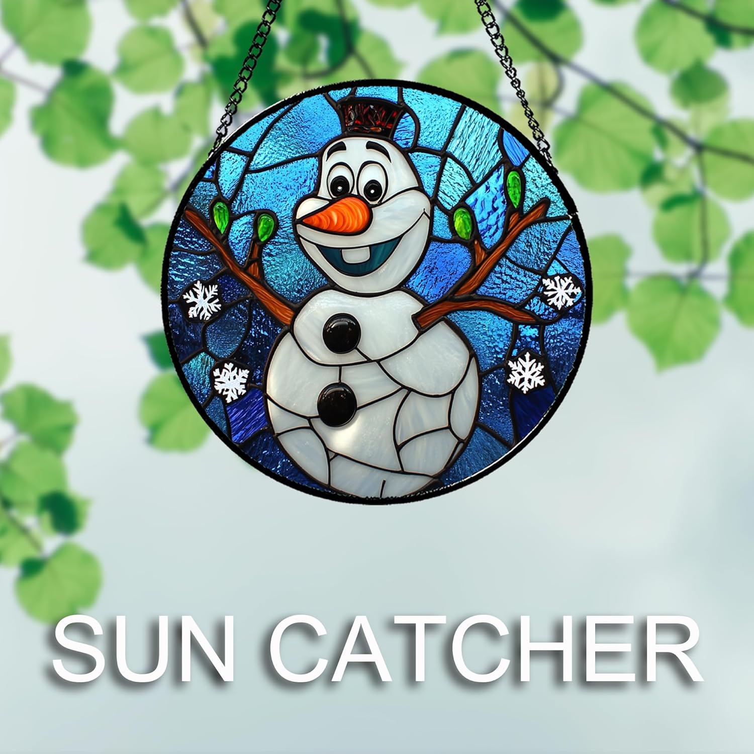 Stained Glass Window Hanging Christmas Funny Snowman 6.3" - Suncatcher Door Garden Blue White Snowflakes Sun Catcher New Year Birthday for Friend Mom Men Woman Nana